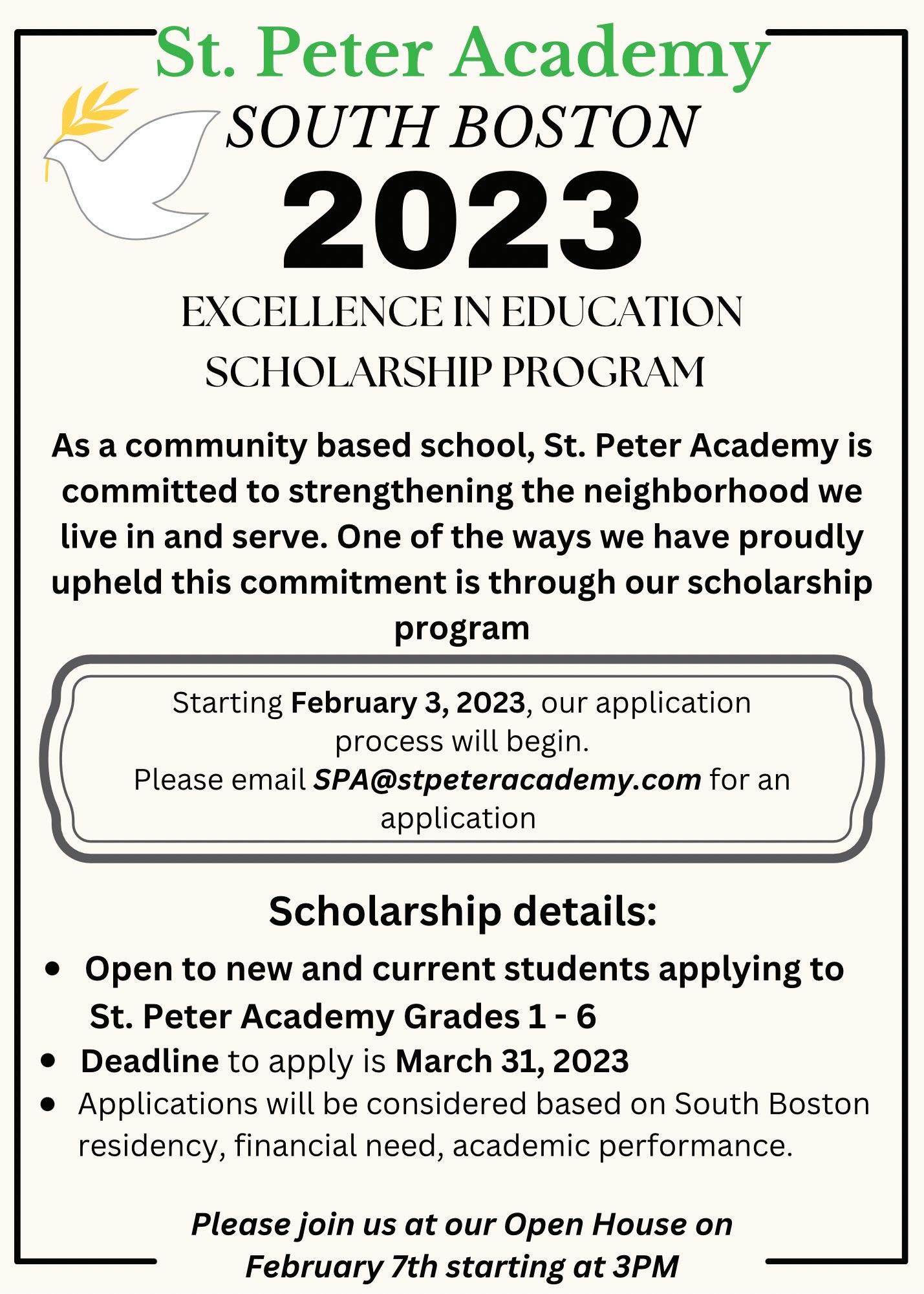 ucators who exemplify the qualities inherent in service to others. Applications will be considered based on South Boston residency, financial need, academic performance. Deadline to apply is March 31, 2023. Please email spa@stpeteracademy. com for an application.