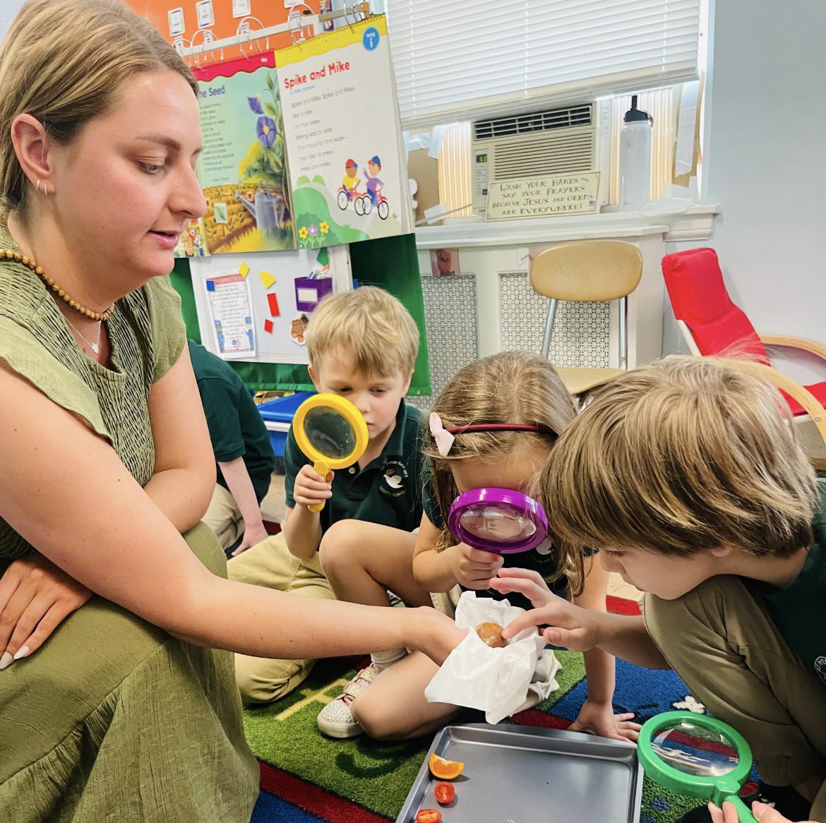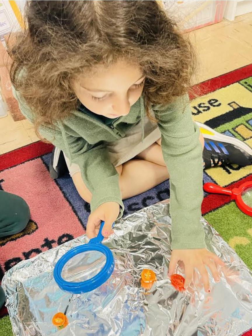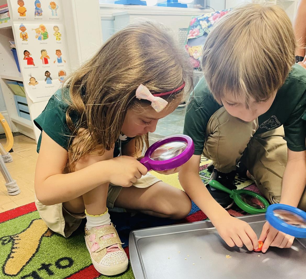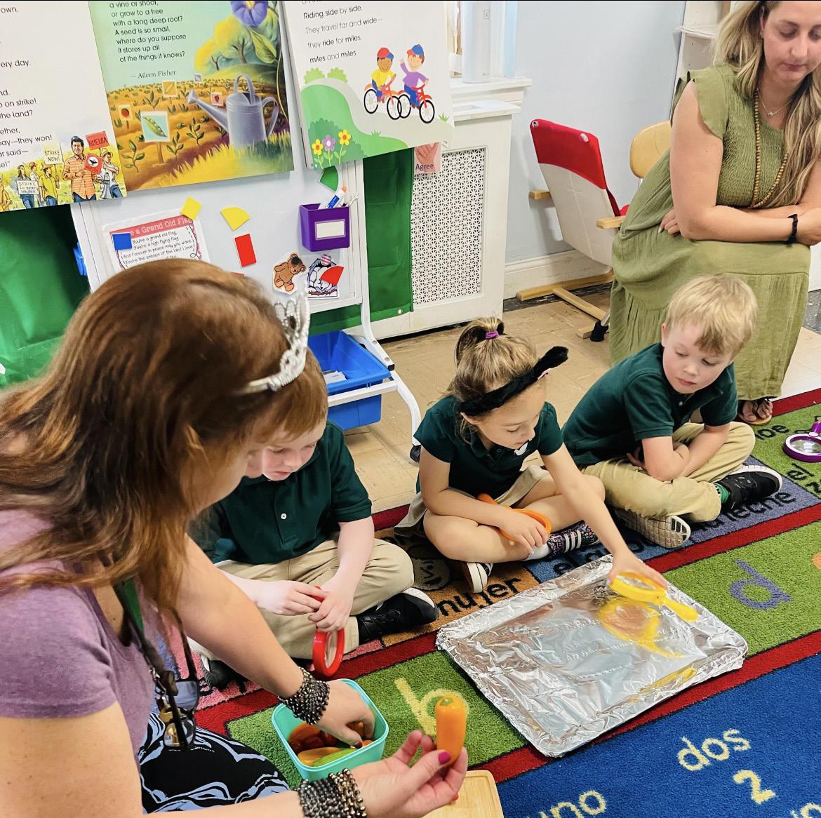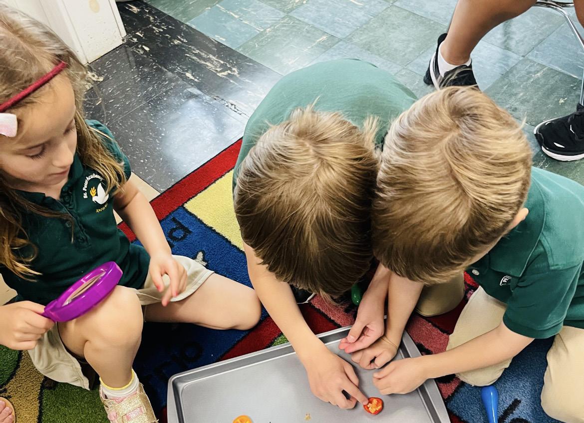 SPA students love learning about Science! Grades K2, 1 and 2 grouped together, having cooperative discussions learning about seeds and plants. In small groups manned with our magnifying glasses we took to searching out mini orange and red pepper seeds,
