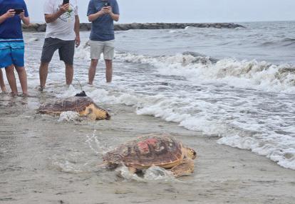 Two rehabilitated loggerhead sea turtles enter Nantucket Sound on July