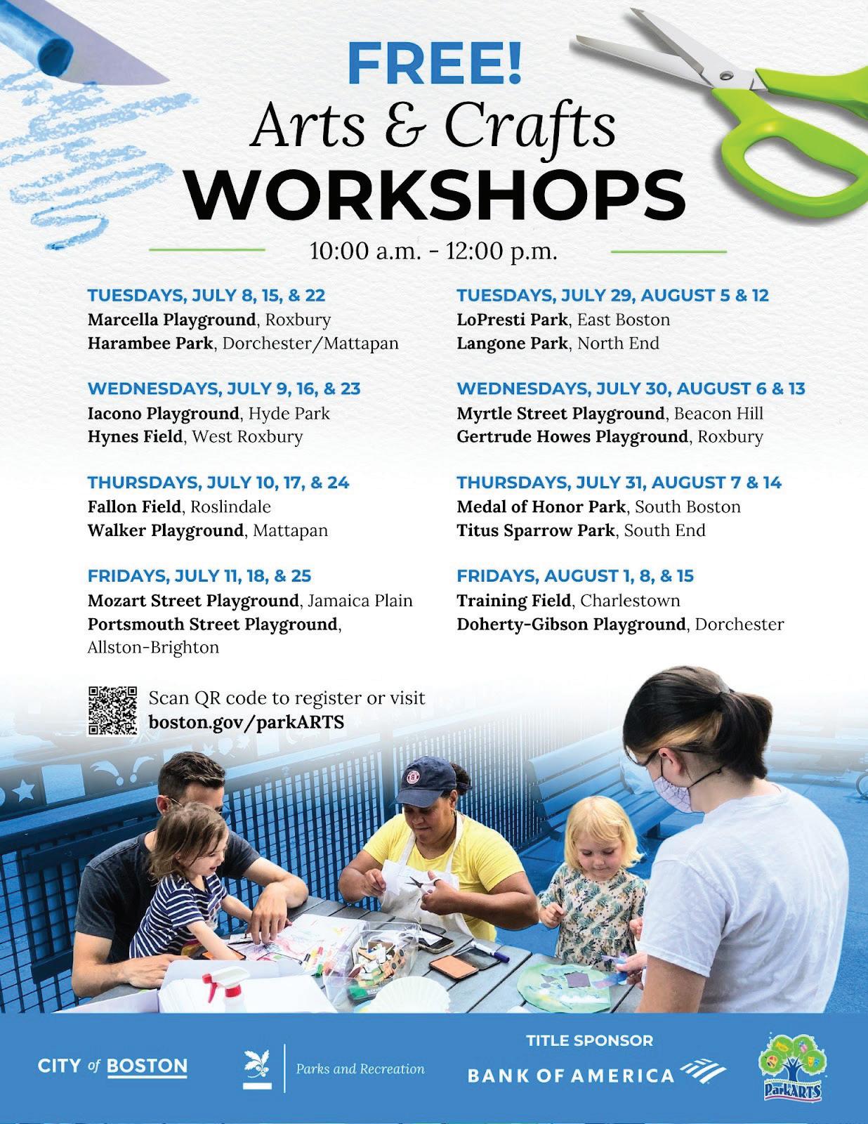 The Boston Parks and Recreation Department’s annual ParkARTS program is pleased to announce the return of free Arts & Crafts Workshops for children. From West Roxbury to East Boston, kids ages three to ten can enjoy a wide variety of arts and crafts activities led by local artists at the workshops held from 10 a.m. to 12 noon.