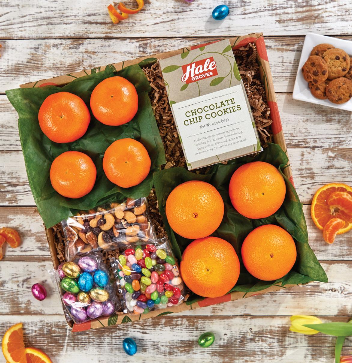 A springtime version of our popular gift box. We’ve updated our Grove Favorites Gift Box with spring and Easter treats. You’ll find our Grove Oranges and Honey-Sweet Tangerines, now with Milk Chocolate Easter Eggs, Assorted Jelly Belly® Beans, Chocolate Chip Cookies and Fruit and Nut Snack Mix. A little something for everyone in this version of our classic gift. #254S (approx. 5 lbs.)
