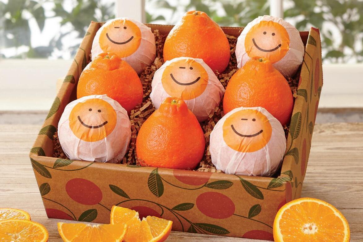 Your message comes through loud and clear when delivered on nine of Hale’s classic Grove Navels. Our premium seedless oranges are even more special when wrapped in smiley face tissue paper stamped with your preferred greeting (“Happy Birthday” or “Thank You”)!