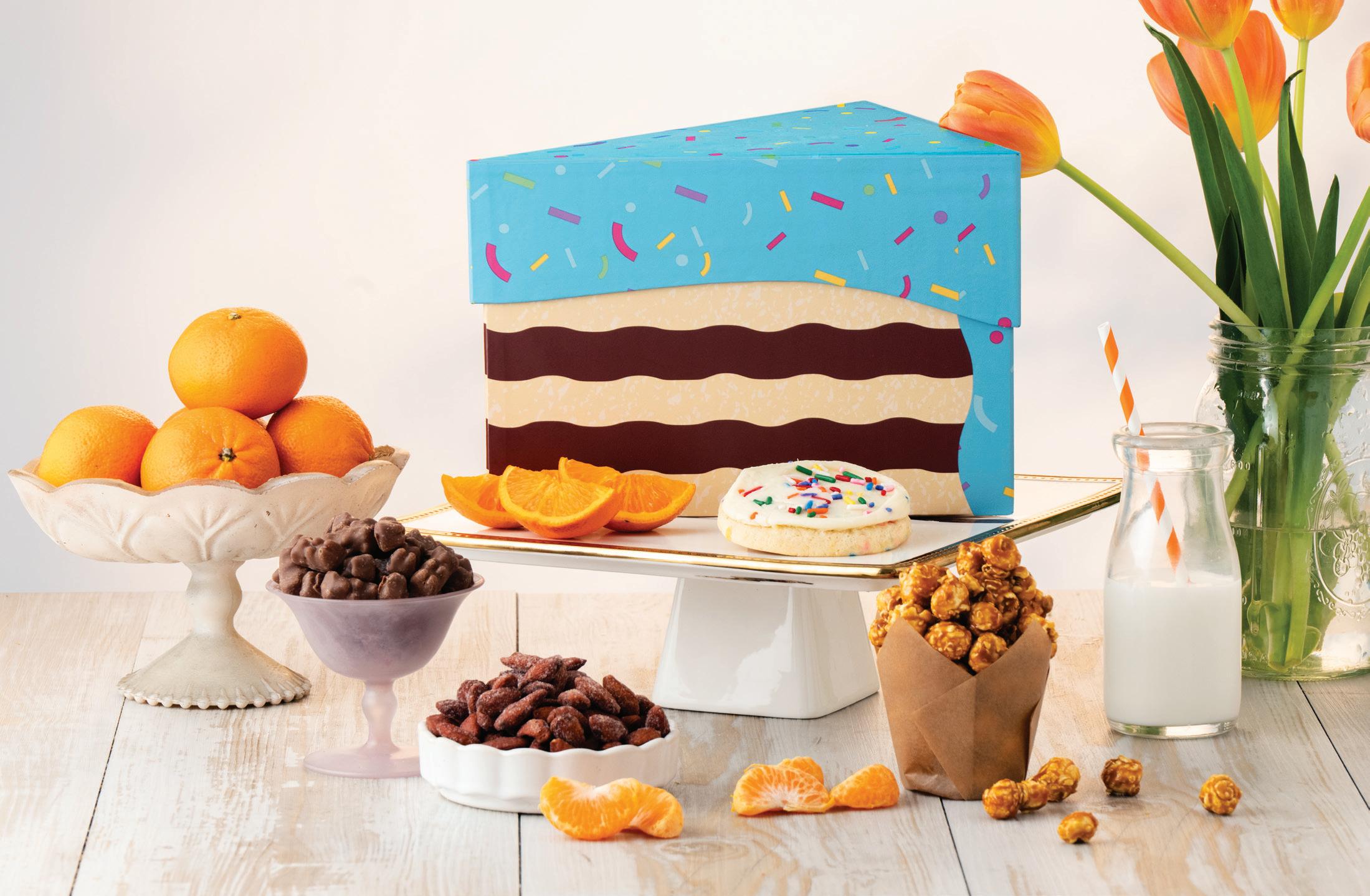 A cute, cake-shaped gift box contains an assortment of treats for every palate: sweet, premium Tangerines, a big, frosted Celebration Cookie with confetti sprinkles, crispy Sea Salt Caramel Crunch Popcorn, crunchy Honey-Roasted Almonds and Milk Chocolate-covered Gummy Bears. #2094 (approx. 4 lbs.) $49.99