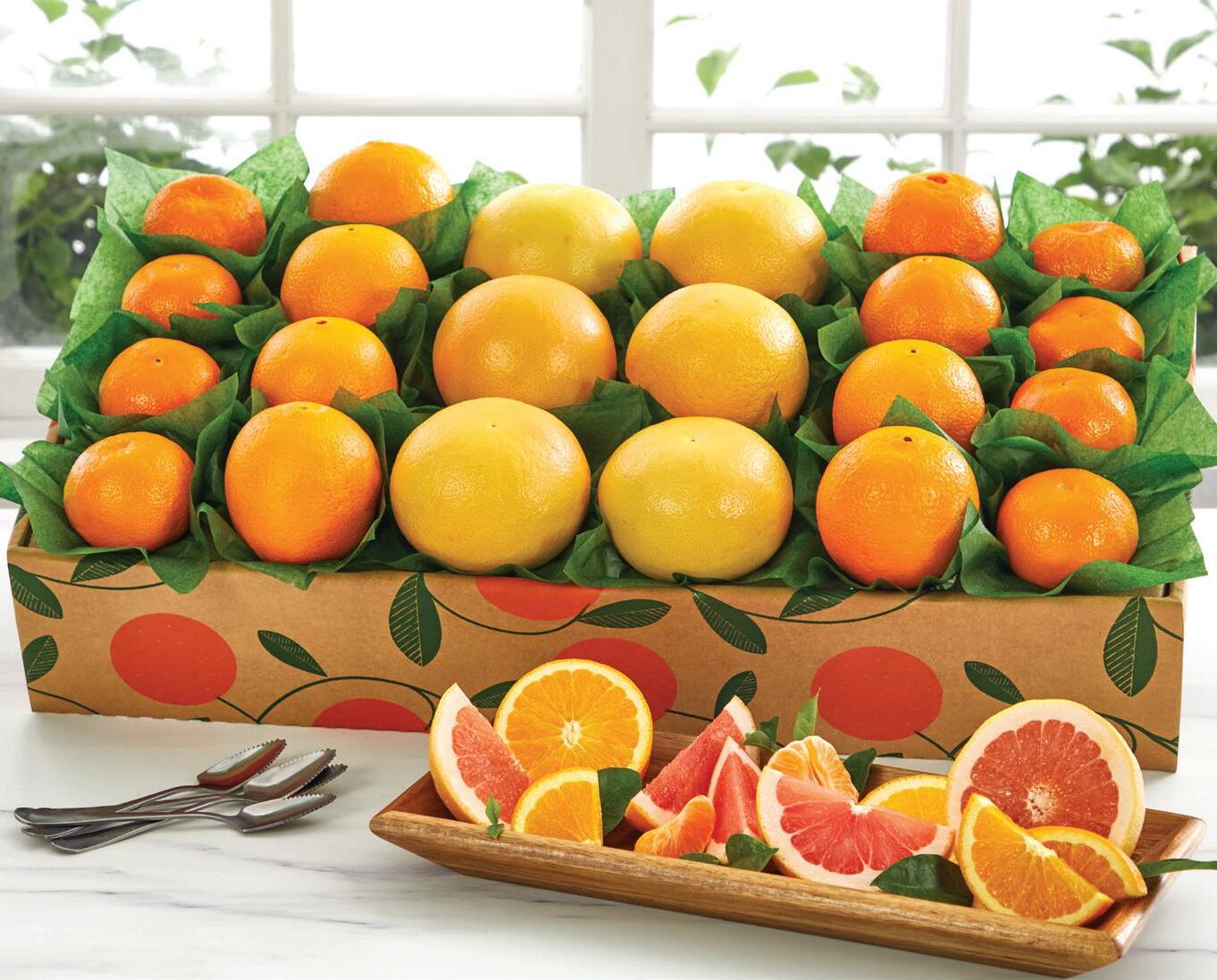 We combine Ruby Red Grapefruit, Grove Navel Oranges and Honey-Sweet Tangerines and package them with four grapefruit spoons (a true Florida favorite). A smaller size is also available!