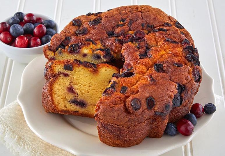 Tart, Cape Cod Cranberries embolden sweet, New England blueberries in this moist, lightly sweet coffeecake for a vibrant flavor that provides a wake-up you can look forward to each morning. Perfect for breakfast, teatime or dessert, this brilliant cake’s colorful smattering of regional berries makes it as lovely a centerpiece as it is a mouthwatering a treat (if you can keep it around long enough to look at, that is)!