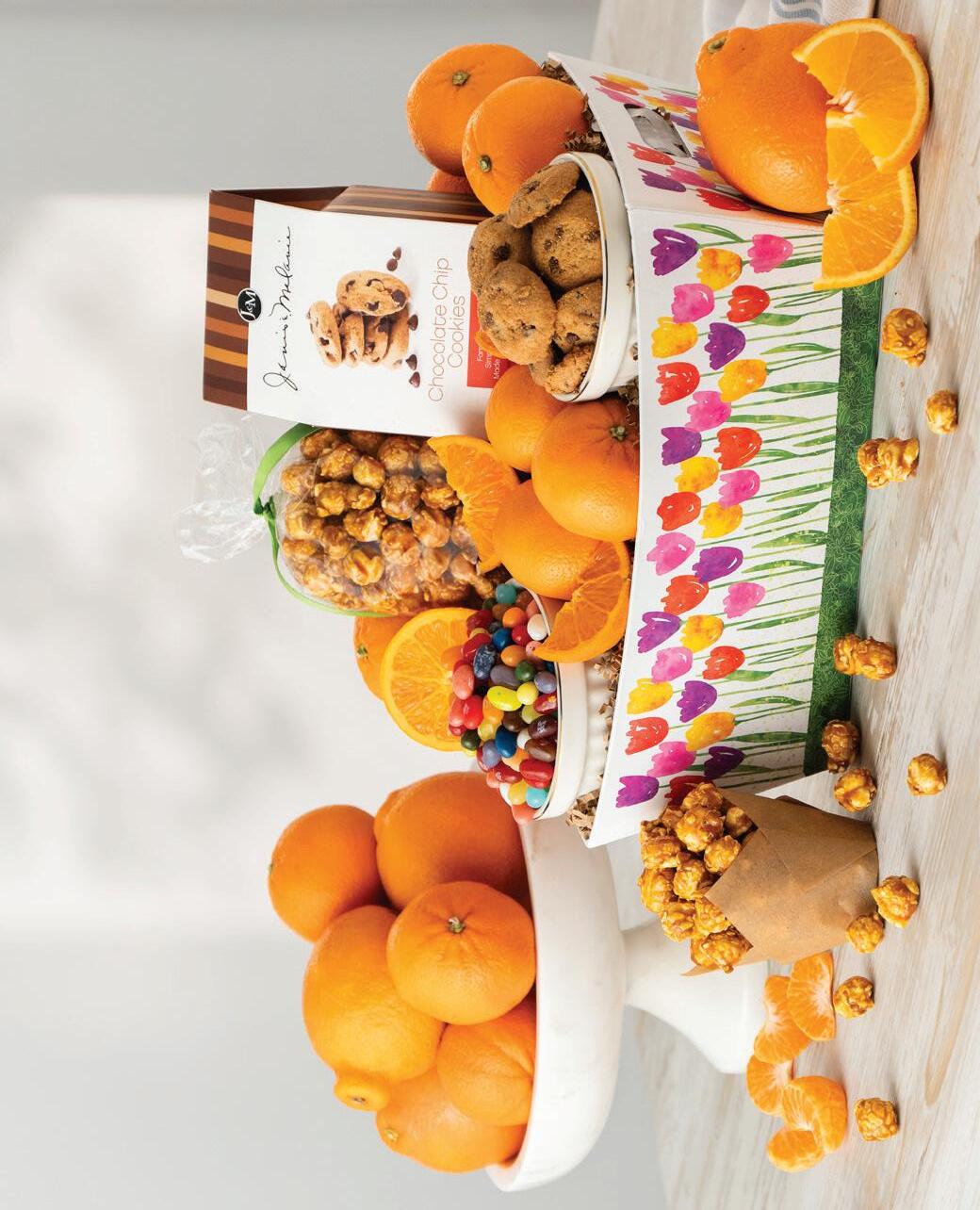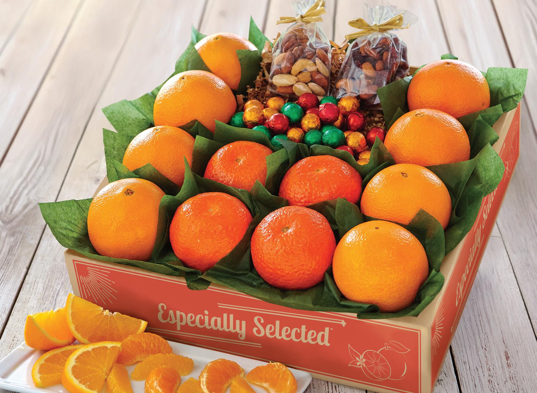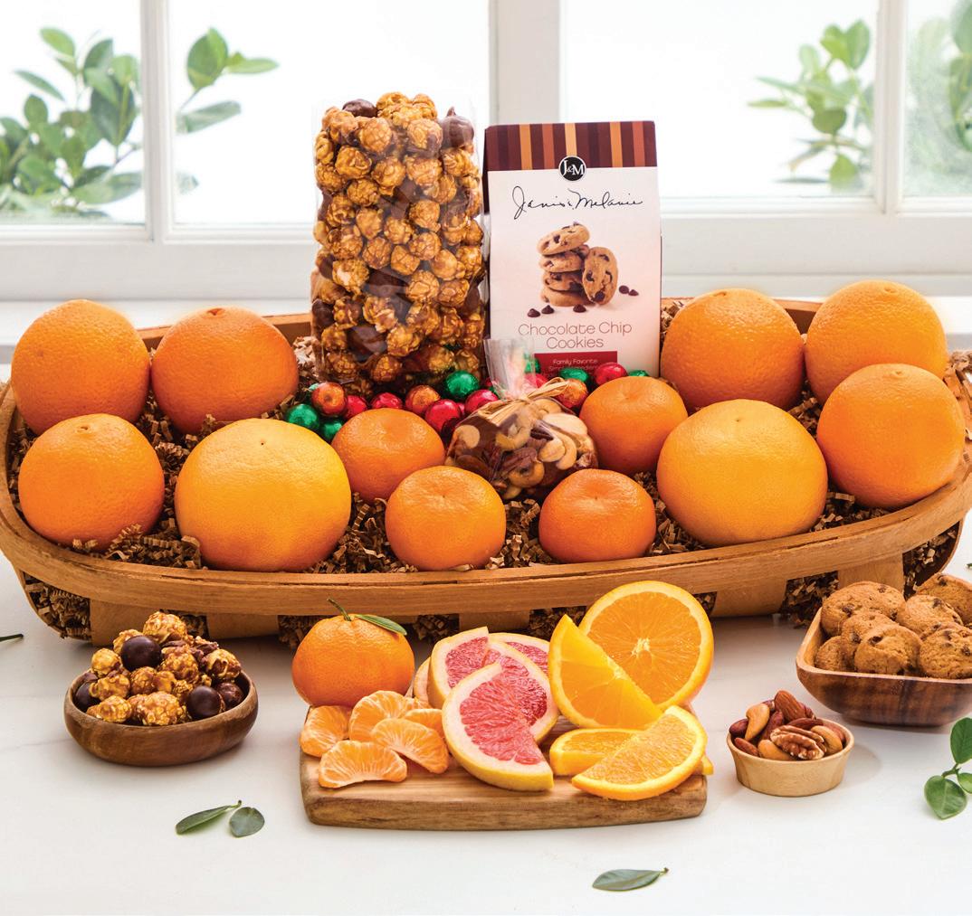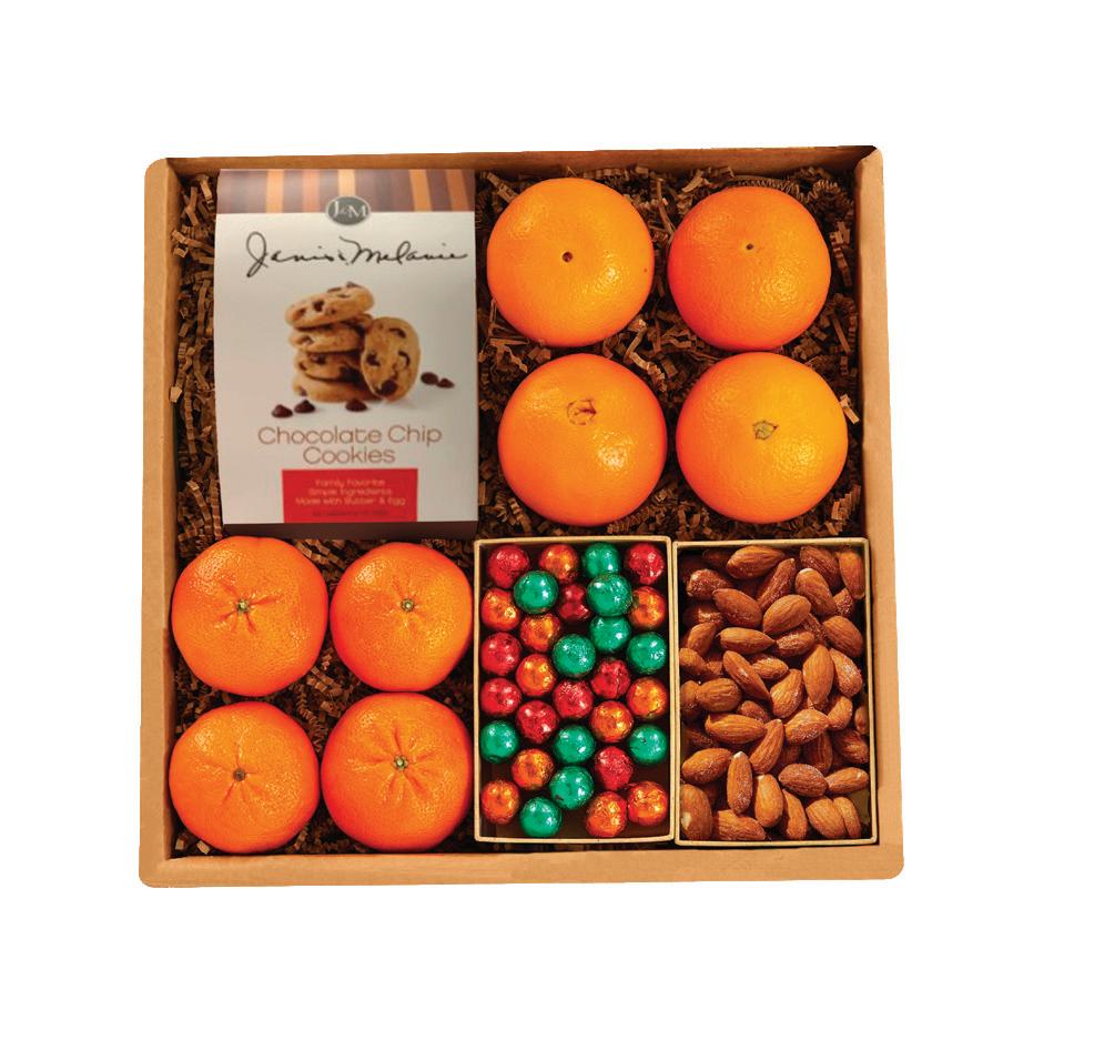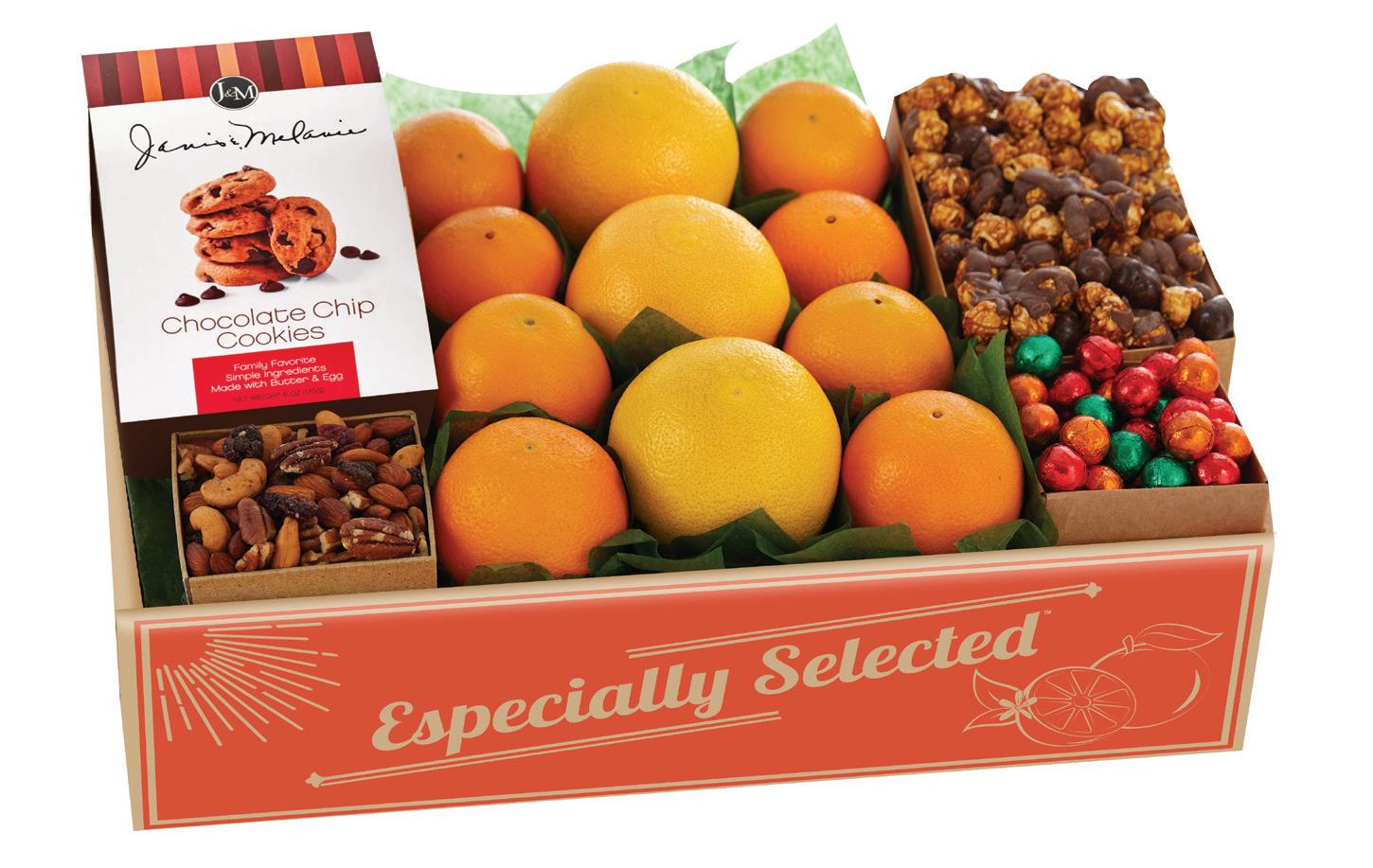 These gifts offer the kind of variety guaranteed to please every palate. It all starts with your choice of the highest quality oranges, mixed citrus or orchard fruit available anywhere — delicious and healthy. We make it more indulgent with Chocolate Crunch Popcorn, Chocolate Chip Cookies, Deluxe Mixed Nuts and foil-wrapped Chocolates.