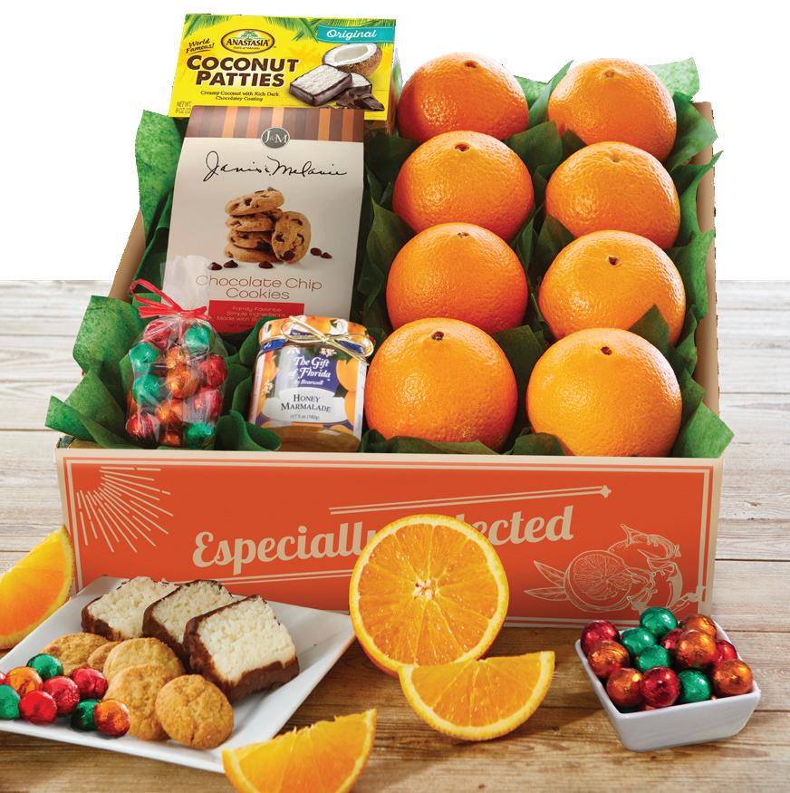 This gift is like sending Florida sunshine in a box. We’ve packed 8 of our highestquality seedless, easy-peel Navel Oranges with a sweet variety of Florida treats. Gift includes Chocolate Chip Cookies, Florida Marmalade, Creamy Coconut Patties and a decadent Milk Chocolates. Great variety for fruit, chocolate and sweets lovers that the whole family will enjoy.