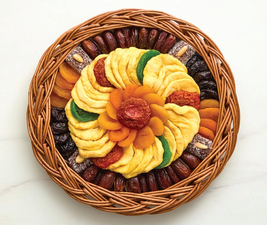 Presented in a keepsake wicker tray is an assortment of all-natural, premium dried fruit: Apple Rings, Pitted Prunes, Kiwi, Angelino Plums, Pears, Apricots, Dates and Peaches. Candy-sweet, colorful and packed with nutrients, it’s healthy as well as satisfying.