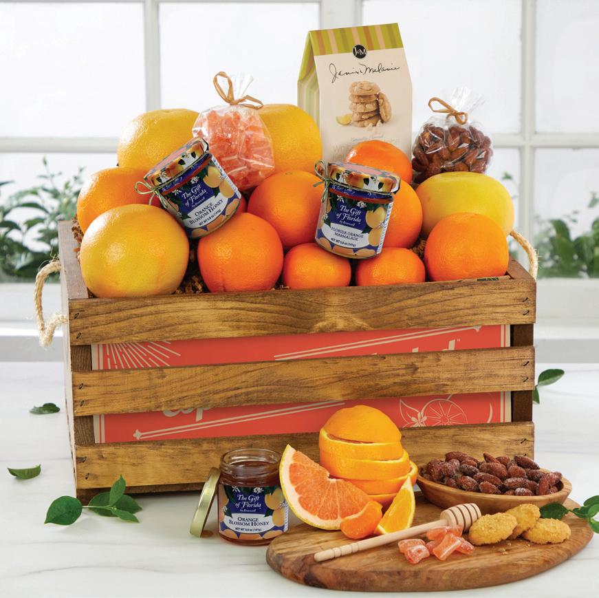 This gift has so many Florida favorites, it’s like taking a road trip through the Sunshine State. The nostalgic wooden crate resembles those found at roadside stands, and it’s generously packed with citrus and more. You’ll find seedless Navel Oranges, easy-peel HoneySweet Tangerines and sweet Ruby Red Grapefruit. It’s all complemented by Orange Marmalade, Orange Blossom Honey, Key Lime Cookies, Honeybell Candy and Honey Roasted Almonds. A Wooden Honey Dipper is also included.