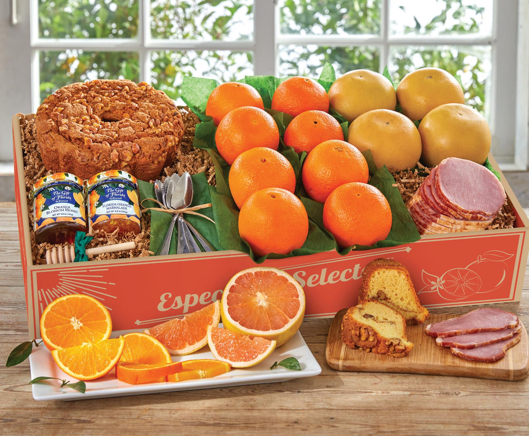 Joining 4 sweet Ruby Red Grapefruit and 8 seedless Navel Oranges in this generous box is our Cinnamon Walnut Coffee Cake, savory Canadian Bacon, and a jar each of our premium Orange Marmalade and Orange Blossom Honey for topping your toast or pancakes. A set of 4 grapefruit spoons and a wooden honey dipper make this a memorable gift.