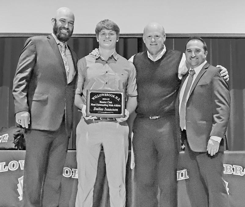 Willowbrook High School’s Athletic Booster Club held its senior athletic banquet near the end of the 2022-23 school year. The banquet, which was held at the school, featured the presentation of scholarships and awards to several members of Willowbrook’s Class of 2023. There were two recipients of the Booster Club’s Most Outstanding Male Athlete award this year. Dallas Isaacson and Isaac Sobieszczyk were both honored with the award. Isaacson was a member of the Warriors’ football and boys gymnastics teams during his senior year. One photo (above) from the banquet shows (left to right) Willowbrook football coach Nick Hildreth, Isaacson, Willowbrook boys gymnastics coach (and Dallas’ father) Andy Isaacson and Willowbrook Athletic Director Brandon Murphy. Sobieszczyk played for Willowbrook’s boys basketball and baseball teams during his senior year. Another photo (below) from the banquet shows (left to right) Willowbrook baseball coach Vic Wisner, Sobieszczyk, Willowbrook boys basketball coach Chris Perkins and Murphy. Isaacson will attend the University of Illinois Urbana-Champaign. Sobieszczyk will attend Bradley University, where he will be a member of the Braves’ baseball team.