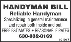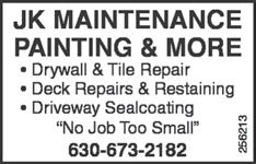 Thursday, Aug. 31, 2023 Rock Valley Publishing Page 19 Blacktop/Paving/Dirt BUSINESS & SERVICE FOR SALE FIND YOUR NEXT JOB IN THE CLASSIFIEDS v v v v v v CALL Elmhurst (630) 834-8244 or Lombard (630) 627-7010 TO PLACE YOUR CLASSIFIED AD! GARAGE SALES Plumbing Building Repair/ Remodeling GREG STEBEN CARPENTRY Small Home Repairs and Remodeling General Carpentry 30 Years Experience “Specializing in Quality Workmanship and Attention to Detail” 630-495-8077 247155 REAL ESTATE FOR RENT PERSONALS Concrete CALL Elmhurst (630) 834-8244 or Lombard (630) 627-7010 TO PLACE YOUR CLASSIFIED AD! CARL WUNSCHEL BLDRS. • Interlocking Flooring •Kitchen/Bathroom Remodeling • Tile Installation & Painting - Guaranteed WorkmanshipFor a fair quote & prompt service call 630-220-8138(cell) or 630-627-7844 369531