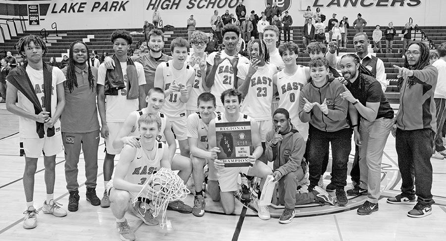 Glenbard East’s boys basketball team won an IHSA Class 4A regional championship last week. The Rams defeated Proviso East 5949 in Friday’s regional final at Lake Park High School’s west campus in Roselle. The victory gave Glenbard East’s boys basketball program its first regional title since 2020. The Rams improved their overall season record to 22-10 with Friday’s victory and advanced to this week’s St. Charles East Sectional. Glenbard East faced Glenbard West in a sectional semifinal earlier this week. Junior Michael Nee (No. 4 - above right) sank five 3-point shots and scored a team-leading 24 points for the Rams in Friday’s regional final. Nee made four 3-point shots during the second quarter to help Glenbard East to a 32-24 halftime lead. Junior Jacob Marynowski (No. 15 - above) provided nine points in the Rams’ win over Proviso East, while senior Devin Kraft (No. 10 - right) contributed eight points.