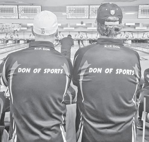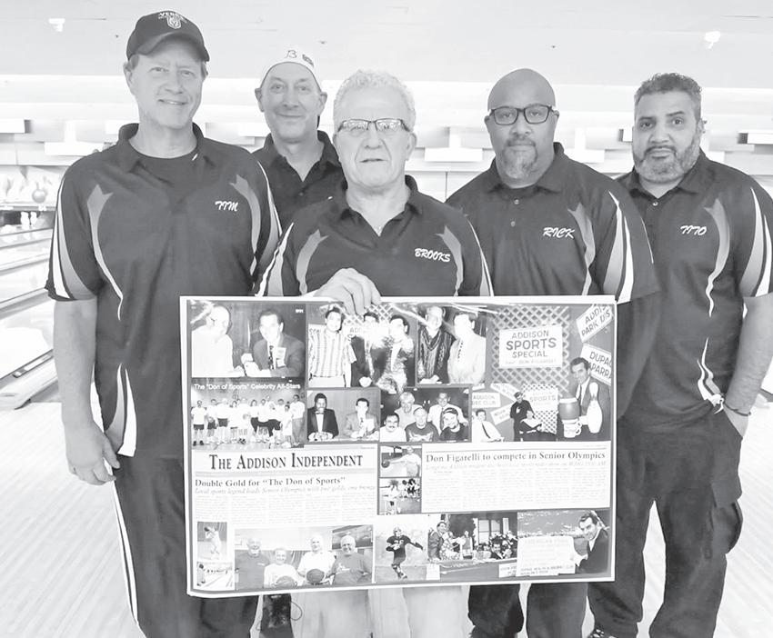 The Don of Sports bowling team, which competes in the Thursday Night Tradesman League at Stardust Bowl in Addison, is wearing specially designed shirts to honor Don Figarelli, who passed away last summer. Figarelli was the team’s sponsor and bowled on the team for several years. Team members, are, above - left to right: Tim Dumas, John Owen, Brooks Robinson Jr., Rick Long and