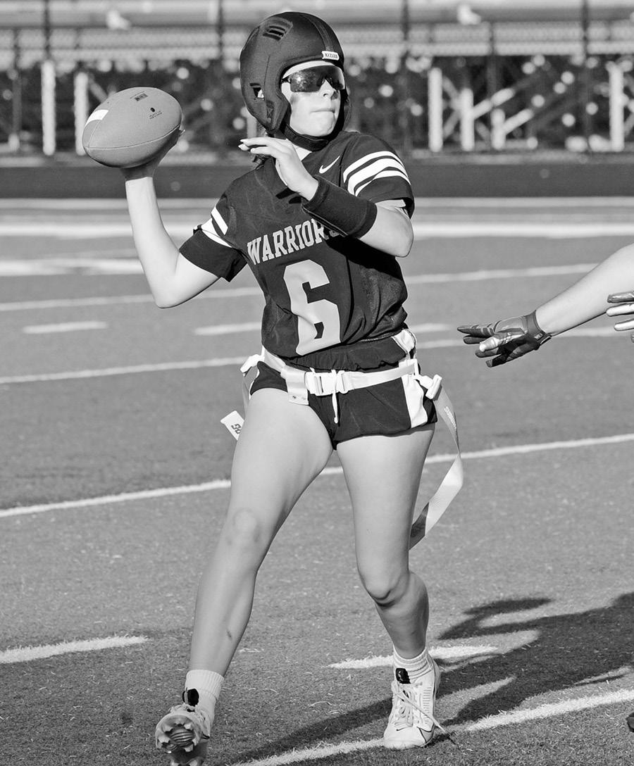 Willowbrook’s flag football team improved its 2023 season record to 4-0 with Saturday’s 59-0 victory over Fenton in Villa Park. The Warriors have shut out all four of their opponents this season. One photo from Saturday’s contest shows sophomore Leigh Bernardo (No. 2 - above) after she scored a first-half touchdown. Another photo shows sophomore quarterback Marli Smrz (No. 6 - top left).