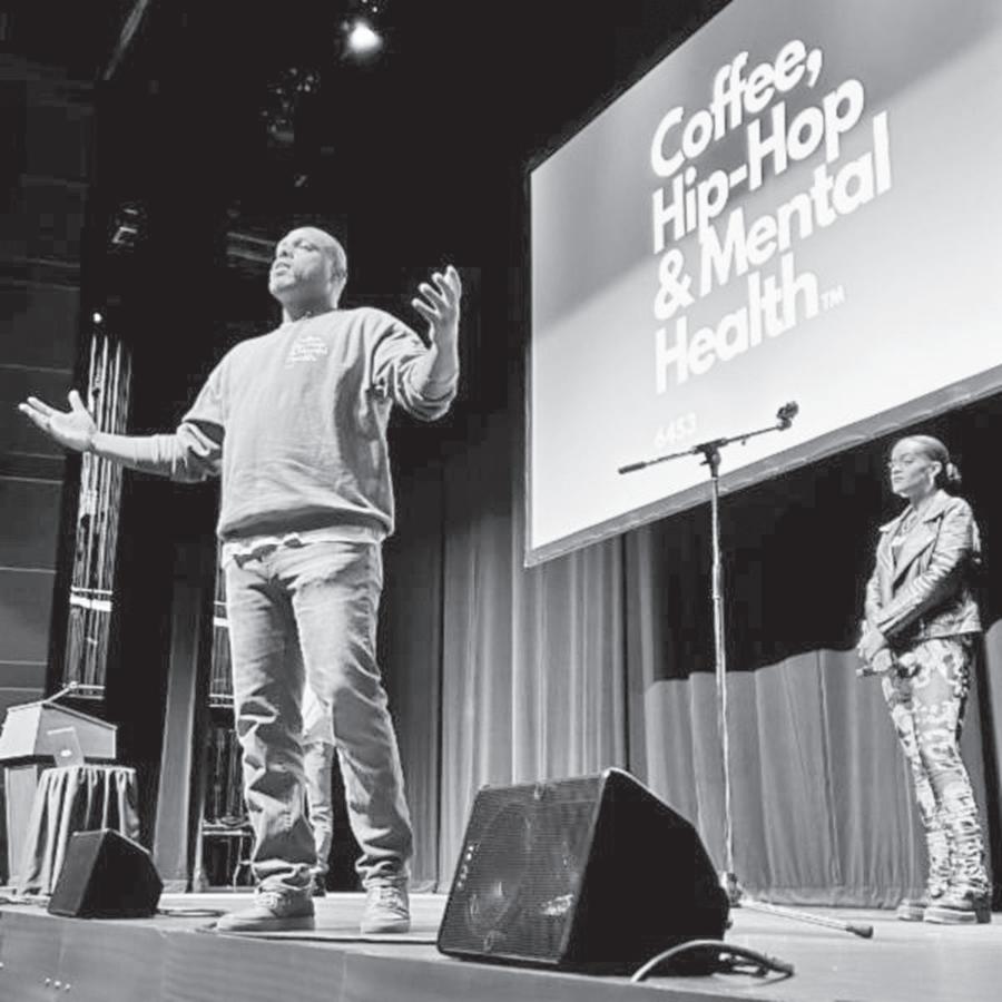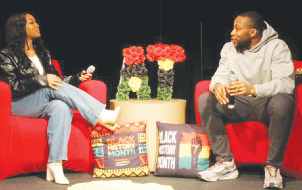 ATHS CLARA ETHERIDGE PHOTO Rock Valley Publishing Taylor Musgrove (left) and Khari Blasingame speak during Addison Trail’s AA Con (African American Conference) on Friday, Feb. 24 to recognize and celebrate Black History Month. About 80 students from Addison Trail and Willowbrook attended the conference. Musgrove is a producer for TMZ, WGN News and ABC 7 Chicago. Blasingame is a fullback for the Chicago Bears.