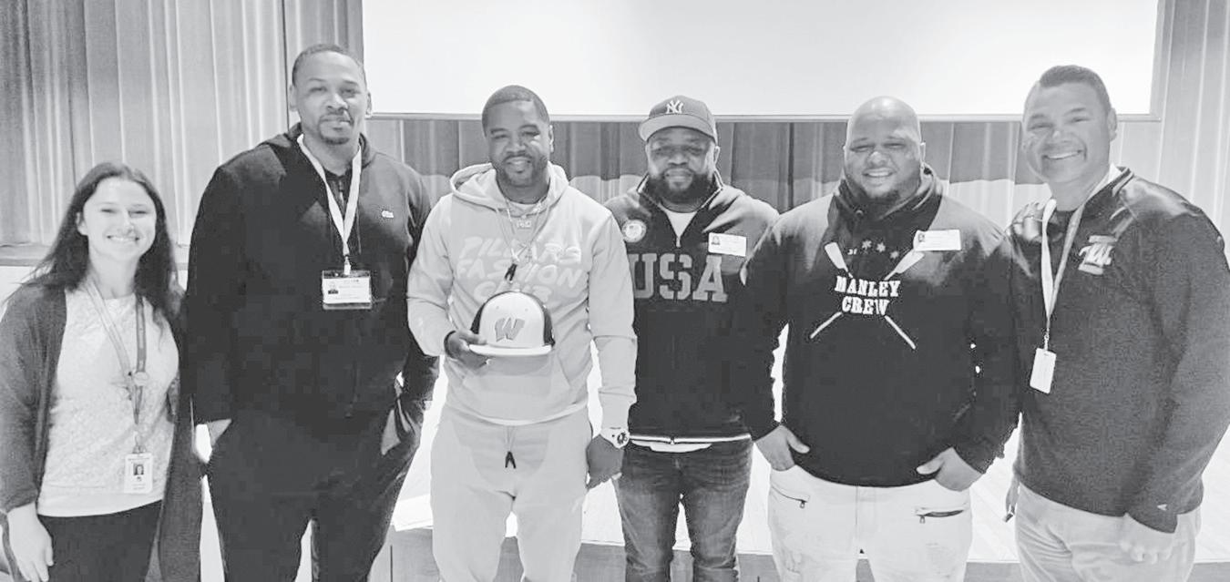 Willowbrook special education teacher Mary Doro (left) and social studies teacher Vic Wisner (far right) greet with this year’s District 88 Author in the House Arshay Cooper and his teammates, Alvin Ross, Preston Grandberry and Malcolm Hawkins. Doro and Wisner have incorporated Cooper’s story into their classroom curriculum for several years and have continued to communicate with him and his teammates.
