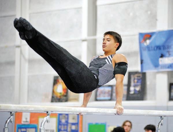 CHRIS FOX PHOTOS Rock Valley Publishing Willowbrook’s boys gymnastics team defeated Addison Trail 131.2 to 105.0 in last week’s dual meet in Villa Park. The April 19 victory over the Blazers gave the Warriors a perfect 4-0 record in this season’s dual meets against West Suburban Gold Conference opponents. Sophomore Daniel Javier (top right) of Willowbrook won individual titles in five events during the meet against Addison Trail. He is pictured during his first-place performance on the parallel bars. Javier won the all-around title in last week’s meet with his score of 47.0. Willowbrook freshman Jae Newman (above) finished second in the all-around standings with his total of 43.3. Newman is pictured during his routine on the horizontal bar, which earned a second-place score of 7.5.