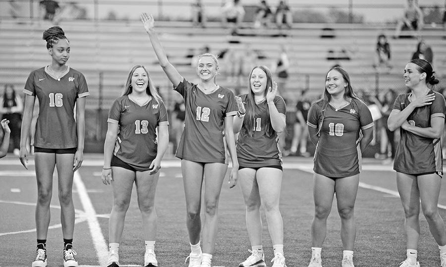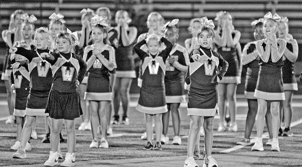 Friday’s Silver and Blue Community Night event at Willowbrook High School celebrated the start of the 2023-24 school year. The first day of student attendance at the Villa Park school was Wednesday, Aug. 16. All of the student-athletes on the Warriors’ fall sports teams were introduced during Friday’s service, which also included scrimmages from the school’s boys soccer, flag football and football teams. The evening also featured performances from the Warriors’ cheerleading and dance teams. The Villa Park Warriors Football and Cheer program’s teams were also introduced. The youth program’s cheerleaders gave a brief performance. One photo (above) shows members of the Warriors’ boys cross-country team running on the stadium track. Another photo (below) shows senior Elle Bruschuk (No. 12) waving to the crowd during the introductions of members of Willowbrook’s girls volleyball team. One more photo (bottom) shows some of the young cheerleaders from the Villa Park Warriors Football and Cheer program performing on the field near the end of Friday’s event.