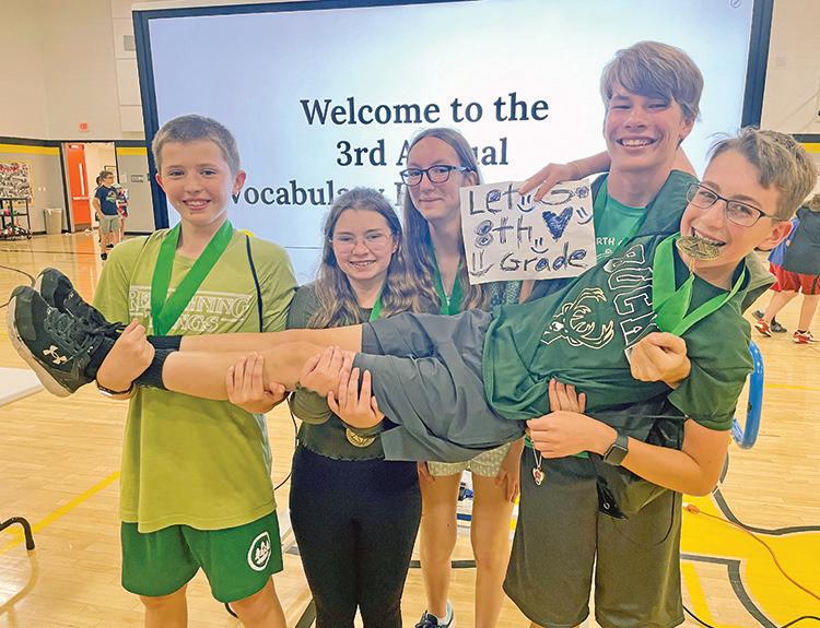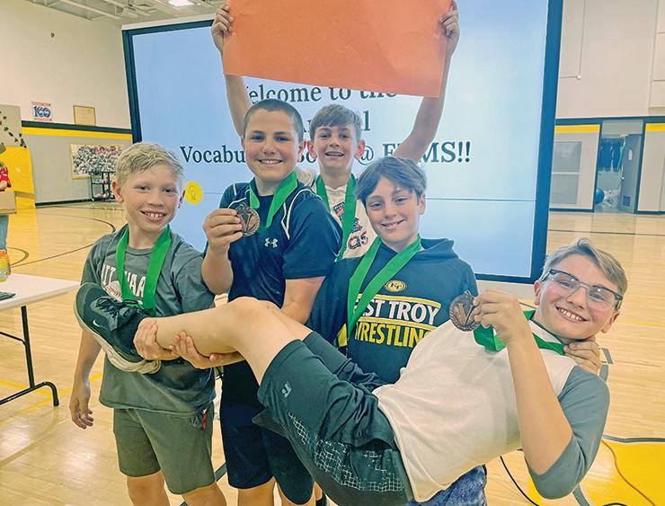 East Troy Middle School students in spring competed in classroom “vocabulary jams” to find the top “vocabularians” in each grade level. This year the eighth-grade students won, with 28 points, seventh grade trailing behind with 13 points. Most of the eigth-grade team also won as sixth graders and as seventh graders, making them three time champs in the third annual Vocabulary Bowl. The event can be viewed on the East Troy Community School District’s YouTube Channel. Clockwise from above, left are: the eighth-grade team of Holden Dierks (from left), Maya Bing, Isabel Banks, Matthew Markham and Matthew Hoff; seventh-grade team of Asher Verlee, Austin Ledin, Ava Tisch, Lia Henthorn and Rose Nelson; and the sixth-grade team of Reichenberger, Brady Singsime, Zach Hoff, Arlan Kehl and Santino Burgos.