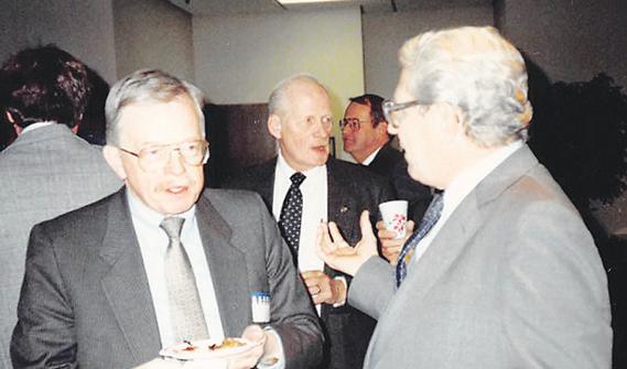 Elmhurst Mayor Charles H. Garrigues (left) chats with then-County Board member Ed Merkel at an event hosted by the Elmhurst Chamber of Commerce & Industry. The photo is not dat ed, but Garrigues served from 1989-1993 before deciding not to seek re-election. He was followed by Mayor Thomas D. Marcucci, who served four consecutive terms, holding the mayor’s chair for 16 years. (Marcucci celebrated a milestone birthday on Oct. 4.)