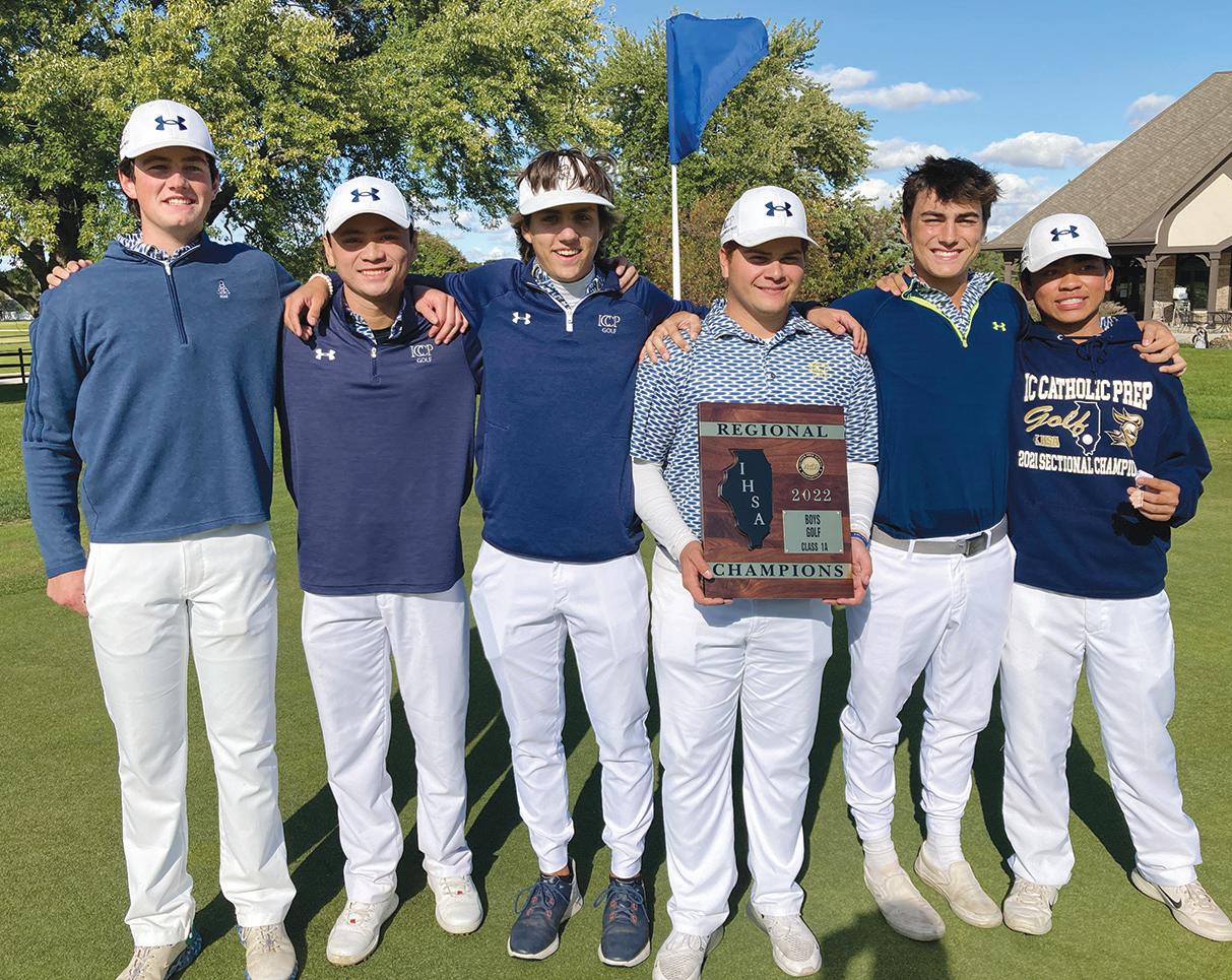 The IC Catholic Prep boys golf team brought home some postsea son hardware after winning its own 12-team Class 1A IC Catholic Prep regional title at Maple Meadows in Wood Dale. In the process the Knights earned their third consecutive trip to the sectional round where they played in the Class 1A Danville sectional ear lier this week where state finals berths were on the line. ICCP was looking for its second trip to the state finals tournament in a row. IC Catholic Prep shot 303 to win it, five strokes better than regional runner-up Chicago Latin School.