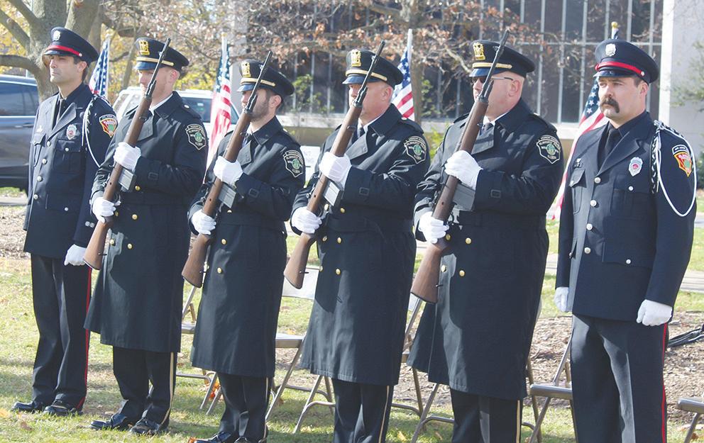 This rifle squad stands at attention, ready to perform a 21-gun salute at the Elmhurst Veterans Day ceremony held in Wilder Park on Friday, Nov. 11. It was well-attended for a chilly morning, but the sky was bright blue, a perfect backdrop for waving flags. More photos inside.