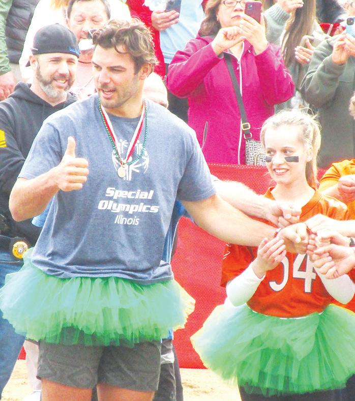 sports organization that offers year-round training and competition in 18 sports to a community of more than 55,000 traditional athletes, young athletes, unified partners, coaches, volunteers, and more. Chicago Bears tight end Cole Kmet (above left) was on hand for the event … and took the plunge himself! Mike McLaughlin (above right) of Elmhurst was the Special Olympics Illinois Polar Plunge ambassador. McLaughlin is a Special Olympics Illinois athlete for 35 years. This is the fifth year McLaughlin has taken the plunge. He currently participates in basketball, bowling, bocce ball, volleyball and softball. In the past, he has competed in tennis, swimming, cross country skiing and track and field. He has worked at Jewel-Osco in Elmhurst for 21 years.
