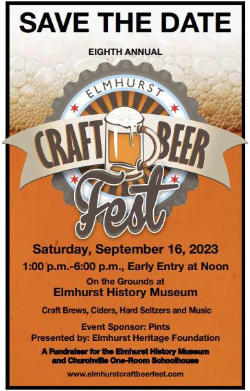 The Elmhurst Heritage Foundation (EHF) has announced the 8th Annual Elmhurst Craft Beer Fest will be held Saturday, Sept. 16, from 1 to 6 p.m., on the grounds of the Elmhurst History Museum.