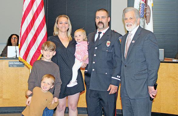 Firefighter Andy Giarratano takes the oath administered by Mayor Scott Levin, leading to Giarratano’s promotion to Lieutenant of the Elmhurst Fire Department. Also at the City Council meeting on Monday is his wife Erin and their daughter Harley, who is 8.