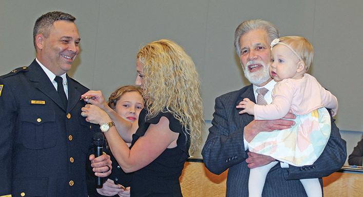 Mayor Scott Levin holds little Maclyn Reynolds, while her mother Samantha pins the badge on Steve Reynolds upon his promotion to Battalion Chief of the Elmhurst Fire Department. Their other children are Olivia, 10, and Owen, 8 (not pictured). Maclyn will be one year old on Friday.
