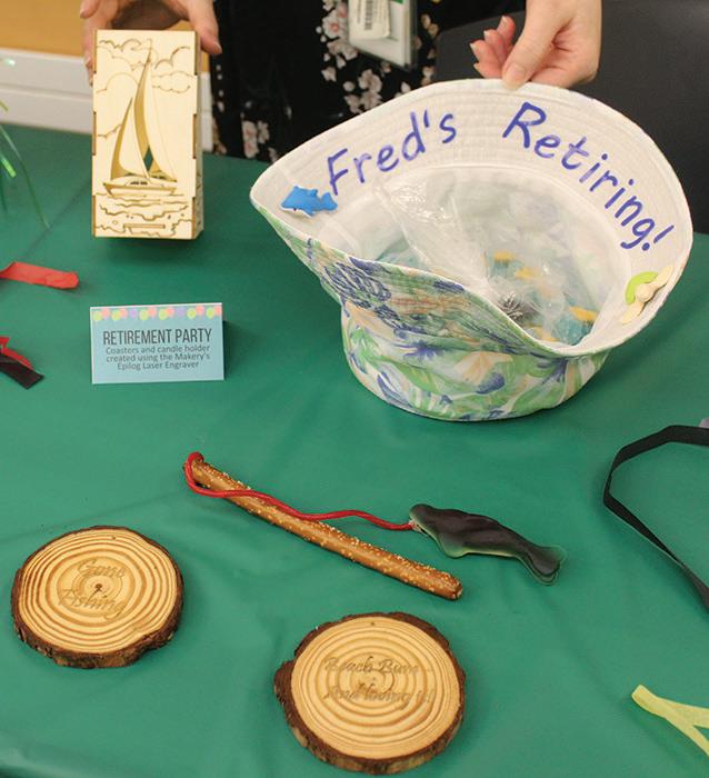 The items on display here were at the Elmhurst Public Library’s Celebrations Showcase on Saturday, April 22. The candleholder (left of hat), the engraved coasters made of branch “slices” were made in the Makery, with Epilog Laser Engraver, as was the “pretzel rod and reel” with the fish