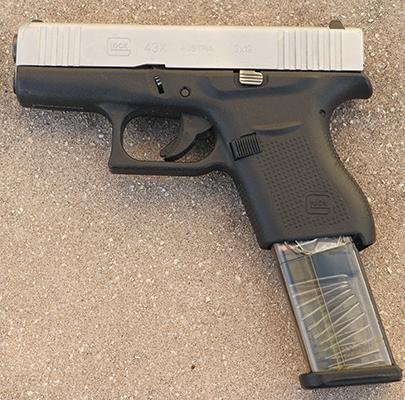 This is a loaded Glock 43X semiautomatic 9mm pistol with an extended ammunition magazine that Elmhurst police found in the vehicle transporting Etonia Henderson and Marquis Henderson following their alleged theft at a store located on the 300 block of S. IL Rte. 83.