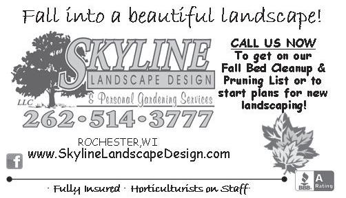 HI-LITER • NOV. 2-8, 2022 • 5 HOME MAINTENANCE SERVICES Copyright © 2022 Stay At Home, Inc. All Rights Reserved. 262 • 514 • 3900 www.stayathomemaintenance.com RESPOND WITHIN 10 DAYS TO RECEIVE YOUR DISCOUNT! IF YOU DO NOT SEE YOUR NEEDS ON OUR LIST GIVE US A CALL TO SEE IF WE CAN ASSIST YOU. DECK - BUILD/REPAIR/STAIN FALL YARD CLEAN UP PRESSURE WASHING LANDSCAPING SHRUB/TREE TRIMMING FLOWER BED CLEAN UP PAINTING - INTERIOR/EXTERIOR GUTTER CLEANING HANDYMAN SERVICES GRAB BARS RAILINGS/STEPS RAMPS - BUILD/REPAIR/STAIN HOME DEBRIS REMOVAL AND MUCH MORE! SAVE NOW! LIMITED TIME OFFER! *Maximum Discount $1000.00. *Cannot be used with any other discounts or offers. 10% OFF Locally Owned Family Business! * o o o o o o o o o o o o FULLY INSURED CALL TODAY FOR YOUR FREE ESTIMATE! o o SENIORS & BABY BOOMERS, DO YOU NEED HELP AROUND YOUR HOME? CALL TODAY FOR YOUR FREE ESTIMATE! Stay At Home is passionate about helping seniors age in place and lending a extra helping hand to baby boomers. Our goal is to help seniors and baby boomers stay in their home and have the same individual take care of your home maintenance needs and put a smile on your face that your “to do list” has been completed. One stop shop for your home maintenance needs. “We Enhance The Beauty Of Your Home” 427374 405030 RHP Logging, llc Based Locally in SE WI • Serving SE WI Since 2011 We Pay The MOST Locally For Lumber/Veneer Trees Extensive Market Knowledge and Domestic/Export Network Paysoff For You! FOREST MANAGEMENT SERVICES: • Tree Tops/Limbs To 6” Utilized And Hauled Off Site • Forestry Mulching Of Brush/Buckthorn Available • Chipping/Clean-Up Available WE BUY TREES!!! 262-339-1096 rhplogging.com peplinskilogging@gmail.com PROMPT FREE ESTIMATES AND PAYMENT Two Acre Minimum For Harvest 11440 W. Loomis Road • Franklin, WI 53132 414.425.5100 • www.LemkesLandscapeSupplies.com FIREWOOD MIXED HARDWOODS $69.95 per heaping yard (approx. 4’x4’ section) PROMPT BULK DELIVERY AVAILABLE FRESH CUT CHRISTMAS TREES AND WREATHS Balsam & Fraser Fir arrive Monday, Nov. 21 (Closed Thanksgiving Day) Hours: Monday - Friday Noon to 8:00 p.m. Saturday & Sunday 9:00 a.m. to 6:00 p.m. 427787 The Land Experts LUKE WESSEL 608.295.8395 LandGuys.net 2925 S. Meadowbrook Rd., Suite G, Springfield, IL 62711 | LandGuys, LLC of Wisconsin 1705 Detloff St, Bloomer, WI 54724 LANDGUYS, LLC is licensed in IL, IA, IN, WI & TN 217.899.1240 HELPING PEOPLE BUY & SELL LAND IN SOUTHEAST WISCONSIN SPECIALIZING IN RURAL HOMES & HOME SITES, HUNTING & FARM LAND 367429 308809 Big and small. We love them all! New Clients Welcome Appointments Appreciated 2548 S. Teut. Rd., Suite B, Burlington, Wis. Marisa (Mo) (262) 210-5262 427641 Ye Olde Hotel In Lyons (262) 763-2701 WEDNESDAY Wings THURSDAY AUCE Special See our Facebook page FRI. & SAT. NIGHT Fish Fry Open Wed-Sat at 4pm Quality clock repair & sales 262-716-6029 OPEN DAILY TUESDAY - SATURDAY 160 E. Chestnut Street (In the loop) Burlington,WI kesslersclockcompany@gmail.com 389117 WE DO SERVICE CALLS FOR GRANDFATHER CLOCKS 427561 MISSING THERAPY ANIMAL Burlington Area Last seen 10/9/22 N. Pine St. area Micro-Chipped Please Call 262-661-6310 427821 Veteran’s Day Gathering FRIDAY, NOVEMBER 11 10:15 a.m. Veteran’s Terrace in Burlington OUR SALUTE To Veterans OPEN TO THE PUBLIC Hosted by American Legion Post #79