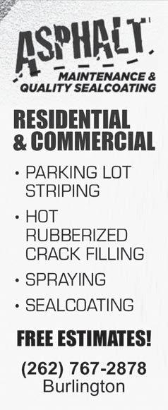 HI-LITER • MAY 31-JUNE 6, 2023 • 5 400 N. Dodge Street • Burlington, WI 53105 262.767.1900 www.burlingtonwi.hamptoninn.com we love having you here.® Clean and fresh Hampton bed TM FREE hot breakfast with fresh waffles Refreshing swimming pool 100% satisfaction guarantee 47801 327590 438727 WE SERVICE ALL MAKES AND MODELS!! 201 S. Pine Street Burlington, WI 262.763.2653 Stop in and see us! 24 HOUR EMERGENCY SERVICE ThielmannGroup.com q FREE QUOTES ON NEW EQUIPMENT q NO TRIP CHARGES q MAINTENANCE CONTRACTS q 0% FINANCING AVAILABLE* *To approved credit. $50 OFF Duct Cleaning 0% FINANCING A/C TUNE-UP SPECIAL $ 94 00 * Expires 6/30/2023 RIZZO & DIERSEN, S.C. ATTORNEYS AT LAW Stephen Clubb Elder Law • Estate Planning 549 Milwaukee Ave., Burlington, WI 53105 (262) 763-0883 411606 438725 Open for tours: Mon.-Fri. 8:30 a.m.-5:30 p.m. Sat. 9 a.m.-3 p.m. Sun. 11 a.m.-3 p.m. Impressive Amenities for your Comfort Open daily for tours! 232 Bridge Street, Burlington, Wis. (262) 763-5959 Experience The Boardwalk Lifestyle ... Comfortable Surroundings, Close to Everything Love Where You Live! • Indoor Parking Available • Heat / Hot Water Included • Library • Complete Appliance Package w/ Washer & Dryer • Fitness Center • Professionally Managed w/ 24 Hr. Emergency Service Call (262) 763-5959 for information today or visit us at www.styza.com 435246
