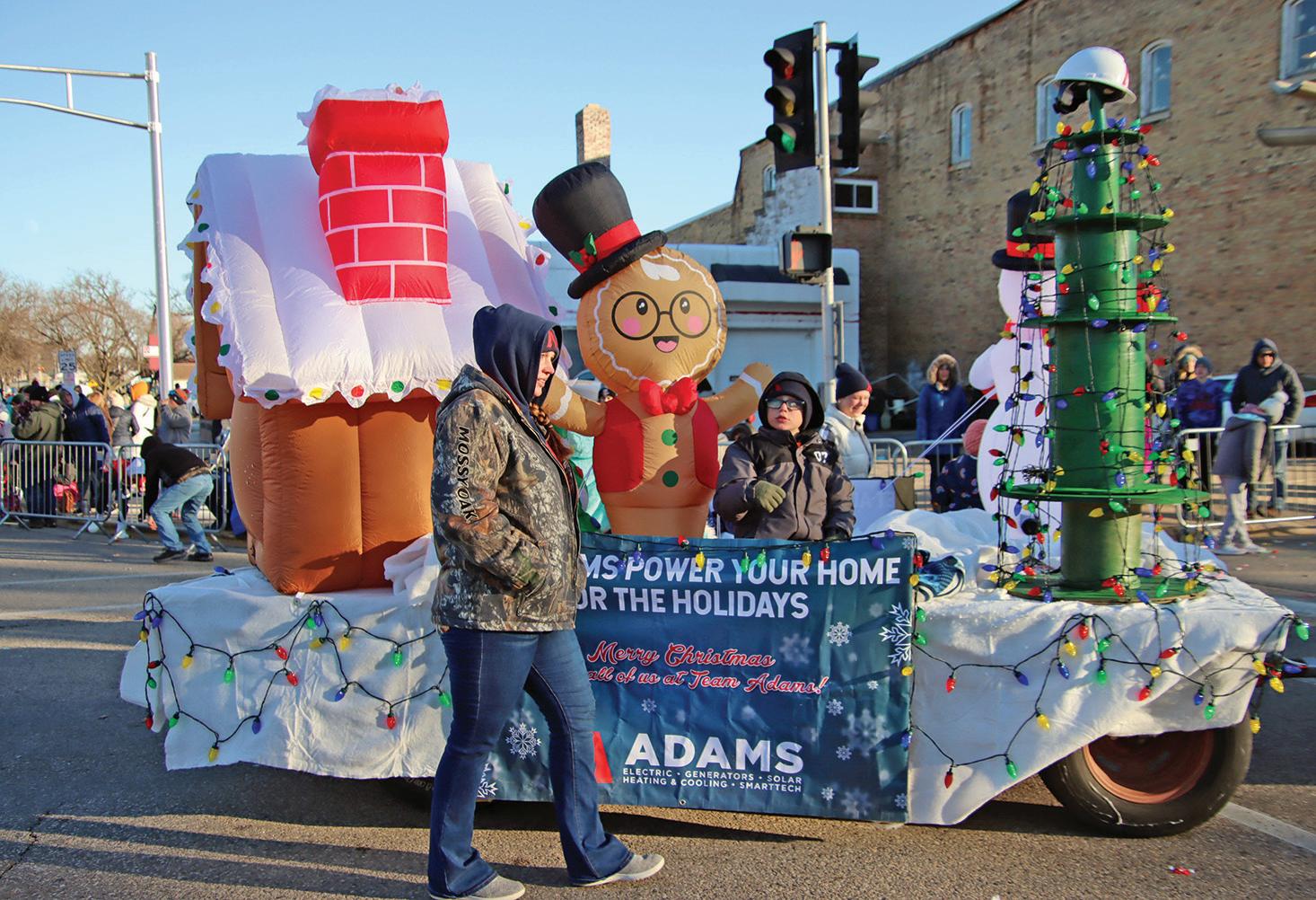 Each year, Elkhorn kicks off its holiday season with the annual Christmas Card parade. Dozens of floats grace the downtown area for the hours-long parade, with area organizations, high school performance groups and even out-of-town acrobats coming to join in the fun. When the parade is over, the Let It Glow display is available at the Walworth County Fairgrounds. clockwise from left: Adams Electric added a little inflatable joy to the parade; stiltwalkers from Madison joined in this year’s parade; the Elkhorn Lions Club participated with its trick car; Frosty the Snowman didn’t melt away; the Sno-Drifters float provided music amidst a candy cane lane or two.