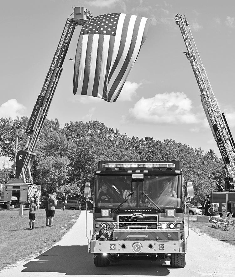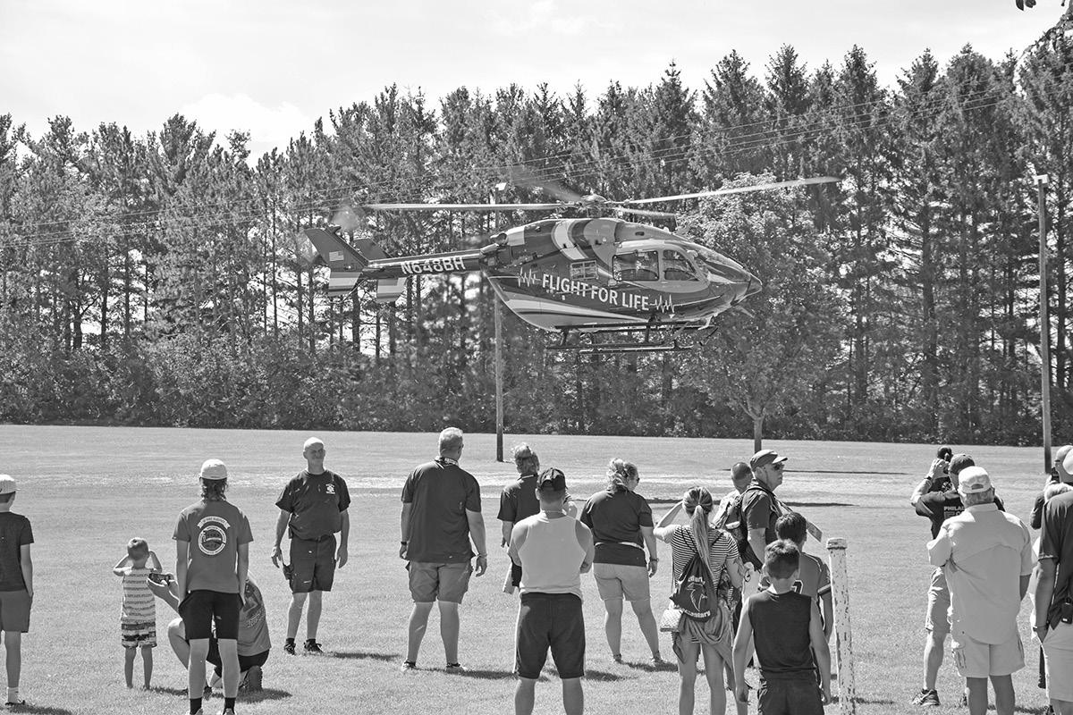 above: The traditional Fire Truck parade drove through the grounds of Camp Timber Lee with campers waving from the windows and turning on the lights and sirens. top: Flight For Life helicopter lands at Camp Timber-lee for campers and visitors to explore. middle: Campers from Burn Camp 2022 –Soaring To New Heights – pose for a group shot during Visitor’s Day Aug. 11. right: Waukesha Fire Inspector Tom Koerner has the pleasure of driving campers/sisters. Pictured from the left are campers Jaishaya, Shaykora and Capresha Evans during the Aug. 11 annual Fire Truck Parade.