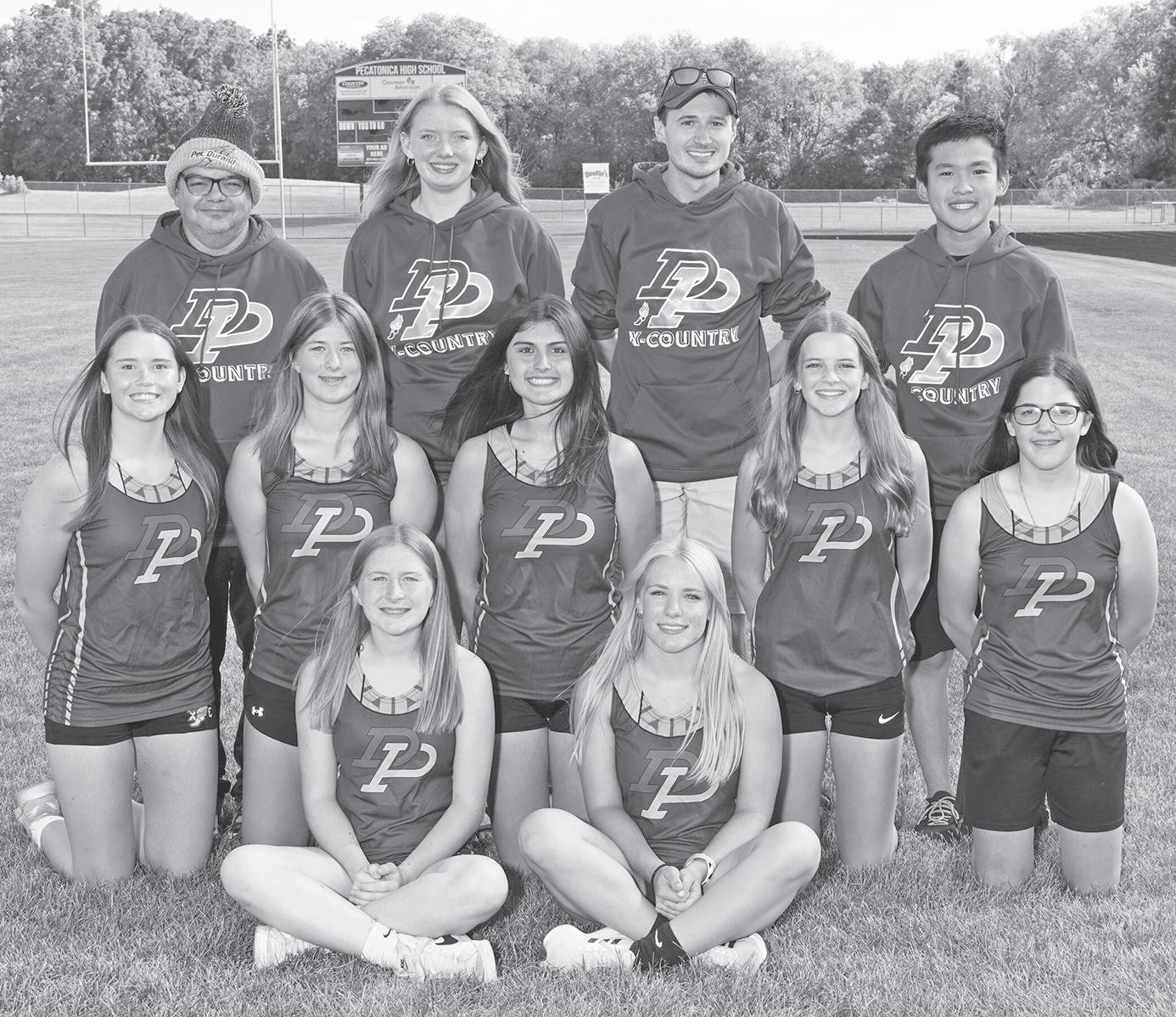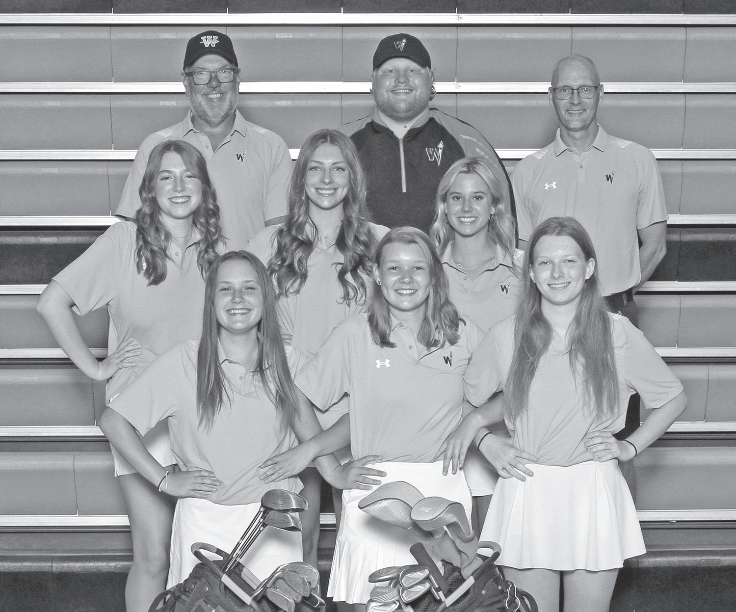 Front row, from left: Micayla Peterson, Evie Anderson. Middle row: Caitland Maines, Charlotte Mears, Savannah Peterson, Emma Daly, Amelia Vandevoorde. Back row: Head Coach Marty Contreras, Manager Brooklyn Connell, Asst. Coach Alex Snyder, Manager Zayne Hoffman.