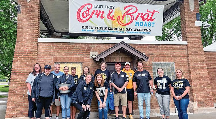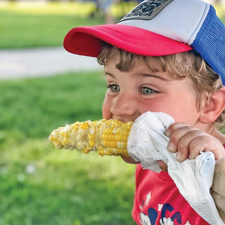 above: The East Troy Community School District brought a crew of volunteers to man the East Troy Area Chamber of Commerce’s 47th annual Corn & Brat Roast, including (from left) Lisa Dragotta, Taylor Baumeister, Quinn Fitch, Andrea Belka Van Buren, Kelly Fitch, Kelly Geisert, Jessie Smith, Jane Wolfe, Amy Foszpanczyk, Mark Weerts, Brian O’Leary, Aaron Judd, Jenny Ledin and Amanda Jones. right: Bryson Strand gets his first taste of the season’s mouthwatering, buttery sweet corn during the Memorial Day Weekend event, which also featured East Troy’s 32nd annual Communitywide Rummage and Brewfest.