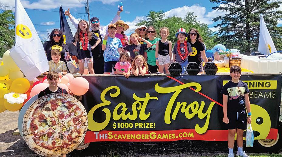 The East Troy Scavenger games made its debut in East Troy’s Fourth of July Parade on June 30 with crew members (from left) Arlan Kehl, Silas Kehl, Vanessa Lenz, East Troy Area Chamber of Commerce Executive Director, Nola Foster, Brett Foster, Ellison Guild, Ayla Guild, Maxine Moody, Loretta Kehl, Addi Guild, Megan Kehl, Molly Moody, Matilda Moody, Avi Foster, Dani Foster and Tommy McCormack.
