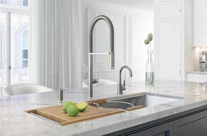 The Tulham Kitchen Collection by Brizo reimagines every detail by combining elegant contours with art deco motifs for an inventive blend of traditional and avant-garde, making it a great addition to a maximalist-inspired kitchen.
