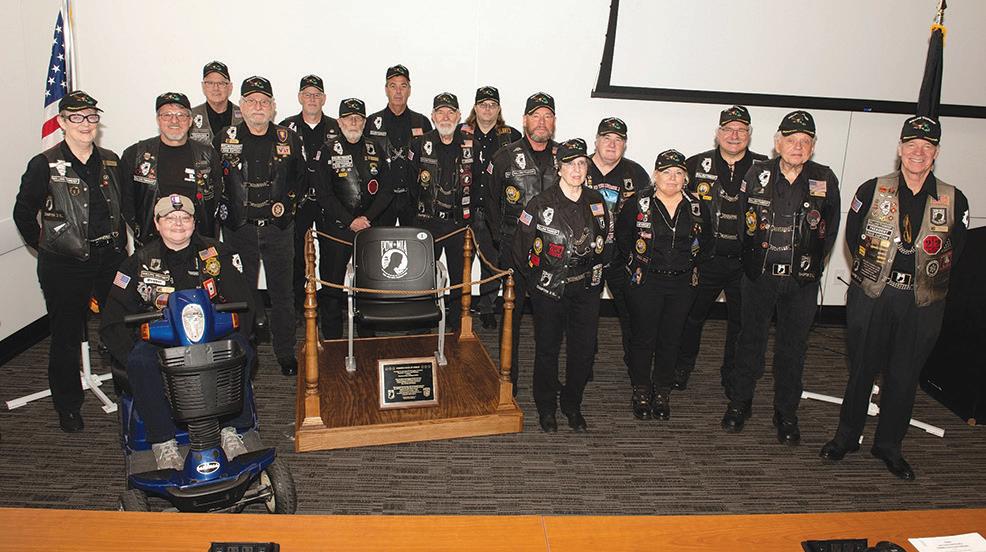 Rolling Thunder Illinois Chapter 2 is pictured with the POW/MIA Chair of Honor that they donated to the Lake County Sheriff’s Office in a ceremony on April 12.