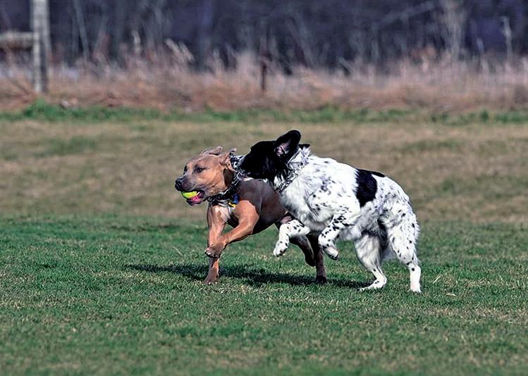 Above: While the brown dog may have caught the tennis ball, his black and white friend keeps up with him as they race through Duck Farm Dog Park. Left: After a very satisfying swim in the lake at Independence Grove Dog Park, a dog returns to the shore. Two of the Lake County Forest Preserves parks have swimming areas.
