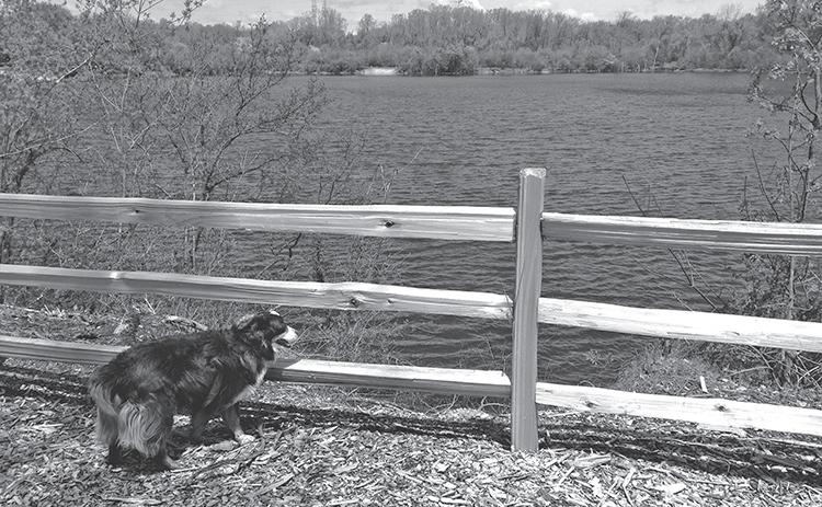 This dog enjoys a view of the beautiful lake at the Independence Grove Dog Park.