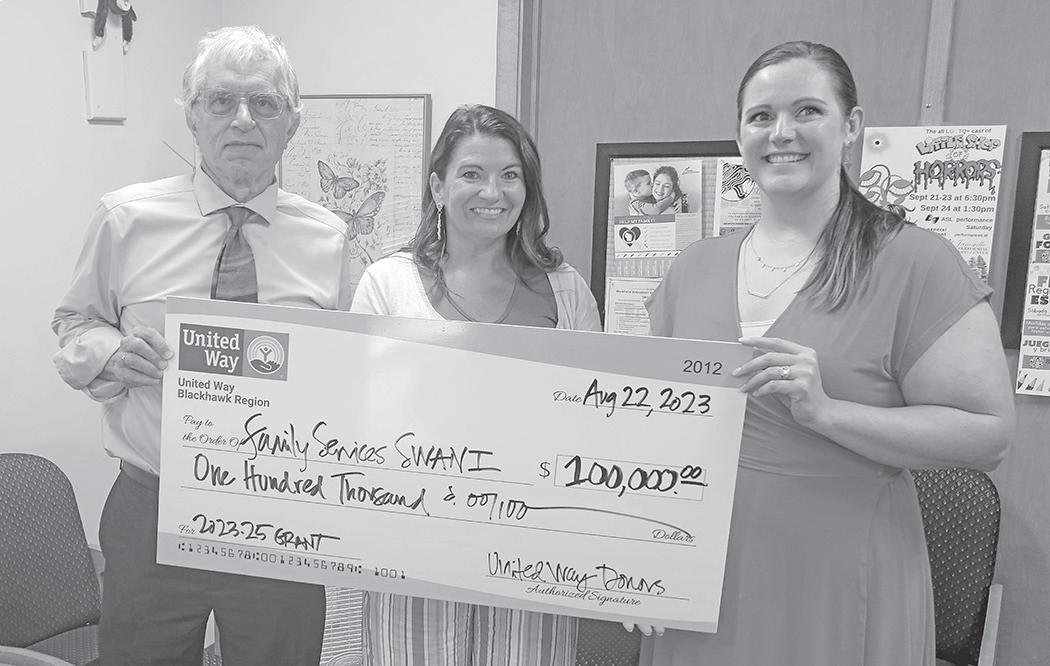 Family Services of S. WI and N. IL, Inc. has been awarded a $100,000 grant from United Way Blackhawk Region for continued support of the domestic violence advocacy program, DEFY Domestic Abuse Beloit. DEFY helped 209 community members in 2022 with 889 hours of direct service, and fronted a total of 2,730 hotlines calls, provided 5,827 items for direct assistance, and $69,000 in financial assistance to survivors. From left: John Pfleiderer, Co-President and CEO of Family Services; Mary Fanning-Penny, Executive Director of United Way Blackhawk Region; and Kelsey Hood-Christenson, Co-President and CEO of Family Services.