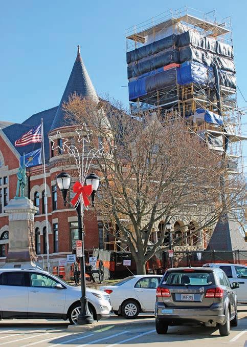 Progress on renovating and reconstructing the his toric Green County Courthouse clock tower continues, with scaffolding on one side of the massive anchor to the county seat’s government and Monroe business district now showing a 100-year rejuvenation.