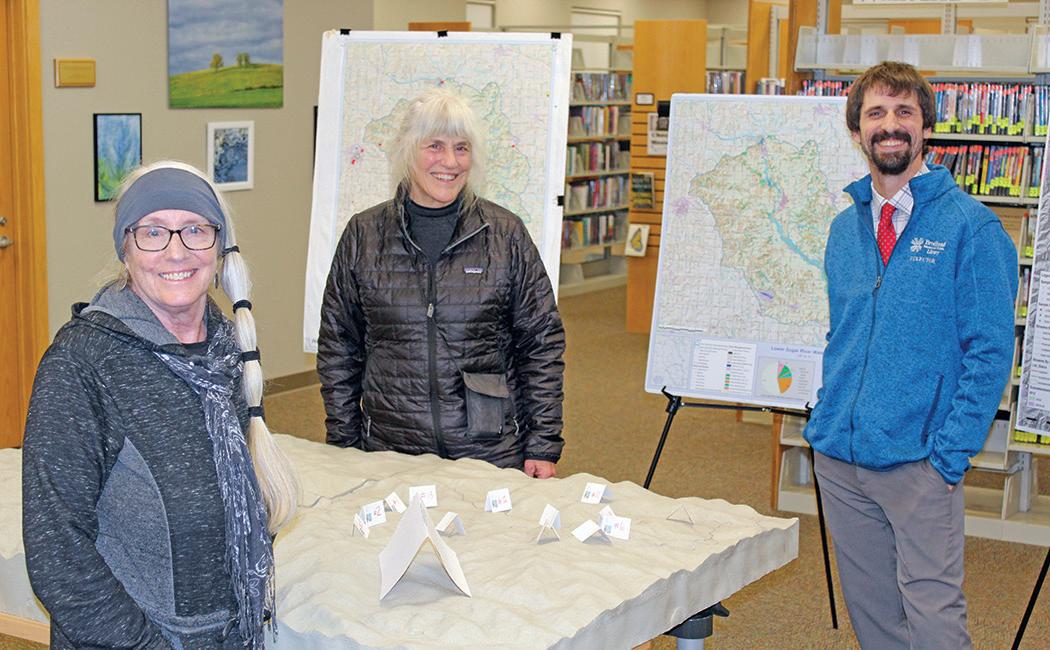 Lower Sugar River Watershed Association Seasons of the Sugar River art show co ordinator Jill Lazorchick-Sampson, LSRWA science team leader Susan Lehnhardt, and Brodhead Public Library Director Kyle Domer gather round a relief of the watershed, among educational posters incorporated into the 8th annual juried art exhibit last week.