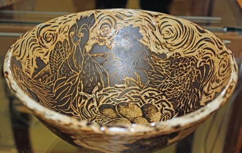 Kathy King’s “New Arrivals” pottery bowl was wood fired in an Anagama kiln just outside of Dodgeville at the Adamah clay studio. This style kiln has a firing chamber with a firebox at one end and a flue at the other; the piec es are fired for 7 days. The glazes are created from local materials; sandstone, dolomite, and local clays.