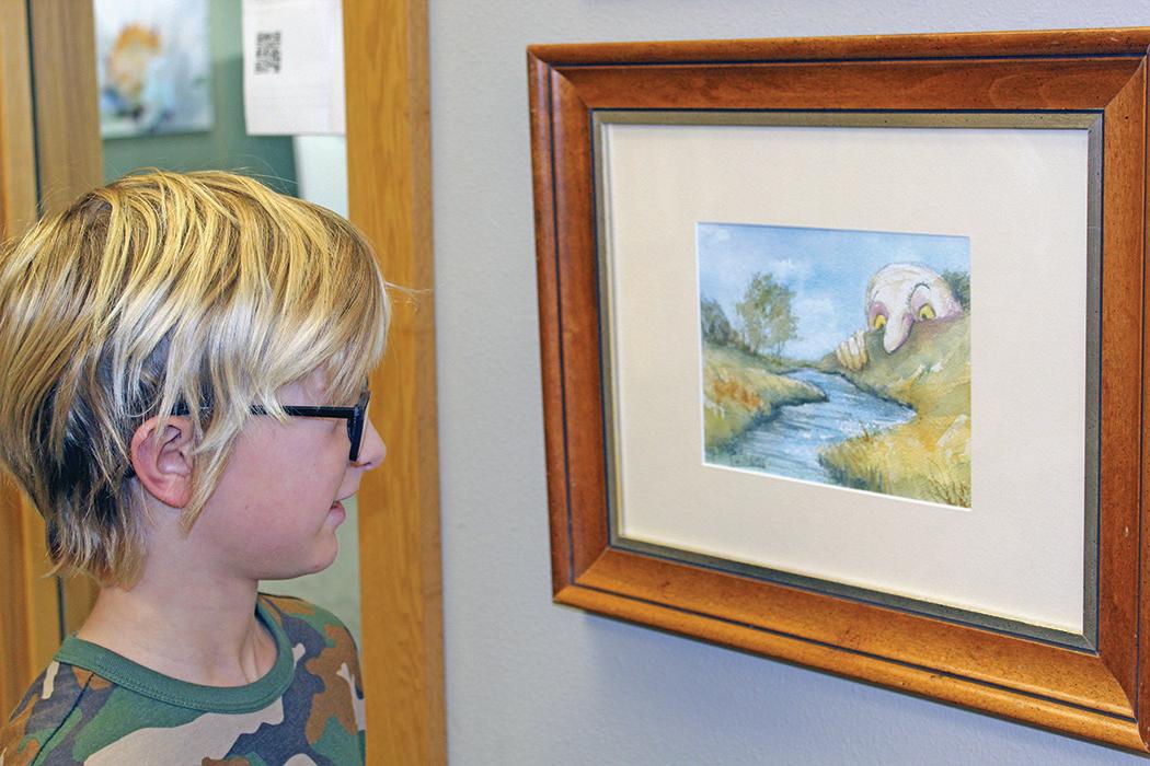 Everett, 9, studies “Watching over the Sugar River,” a watercolor on paper, by David Williams, in the art exhibit.
