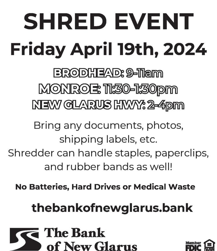 TOWN OF DECATUR Regular Town Board Tuesday April 16, 2024, following Annual Meeting Decatur Town Hall 1408 14th Street, Brodhead WI 53520 MEETING AGENDA: 1. Call to Order 2. Pledge of Allegiance to the Flag 3. Additions/Corrections to the Agenda 4. Approval of Minutes a. March 21, 2024 5. Treasurer’s Report 6. Payment of the Bills 7. Citizen Concerns 8. Roadwork 9. Review ATV ordinance 10. Encroachment-Todd Staffon 11. Updating accounting program 12. Closed session-Wis Stat Sec 19.85 (1) ( c ) (c) Considering employment, promotion, compensation or performance evaluation data of any public employee over which the governmental body has jurisdiction or exercises responsibility. 13. Reconvene to open session 14. Discussion and possible action on topic discussed in closed session 15. Additional information and correspondences 16. Future agenda items 17. Set Dates for Future Meetings 18. Adjournment Emma Brugger Clerk/Treasurer Posted April 5, 2024 at Town Hall, Newspaper, Website, Trackside Mobil, Brodhead Library Follow us on our website https:// townofdecaturwi.gov/ The Independent Register 4/10/2024 WNAXLP 453844 Subscribe to your hometown newspaper with a digitalsubscription! For a digital subscription with a weekly emailed link, just go to ROCKVALLEYENEWS.COM Click on “AVAILABLE SUBSCRIPTIONS” in the menu bar at the top of the page to choose your newspaper. Start your electronic subscription today! Rock ValleyPublishing LLC 815-877-4044 REAL NEWS is in the NEWSPAPER The Post Journal • The Rockford Journal The Herald • The Gazette • Tempo Belvidere Republican • Scoop Today Shopper’s Guide • The Clinton Topper The Independent-Register 442724